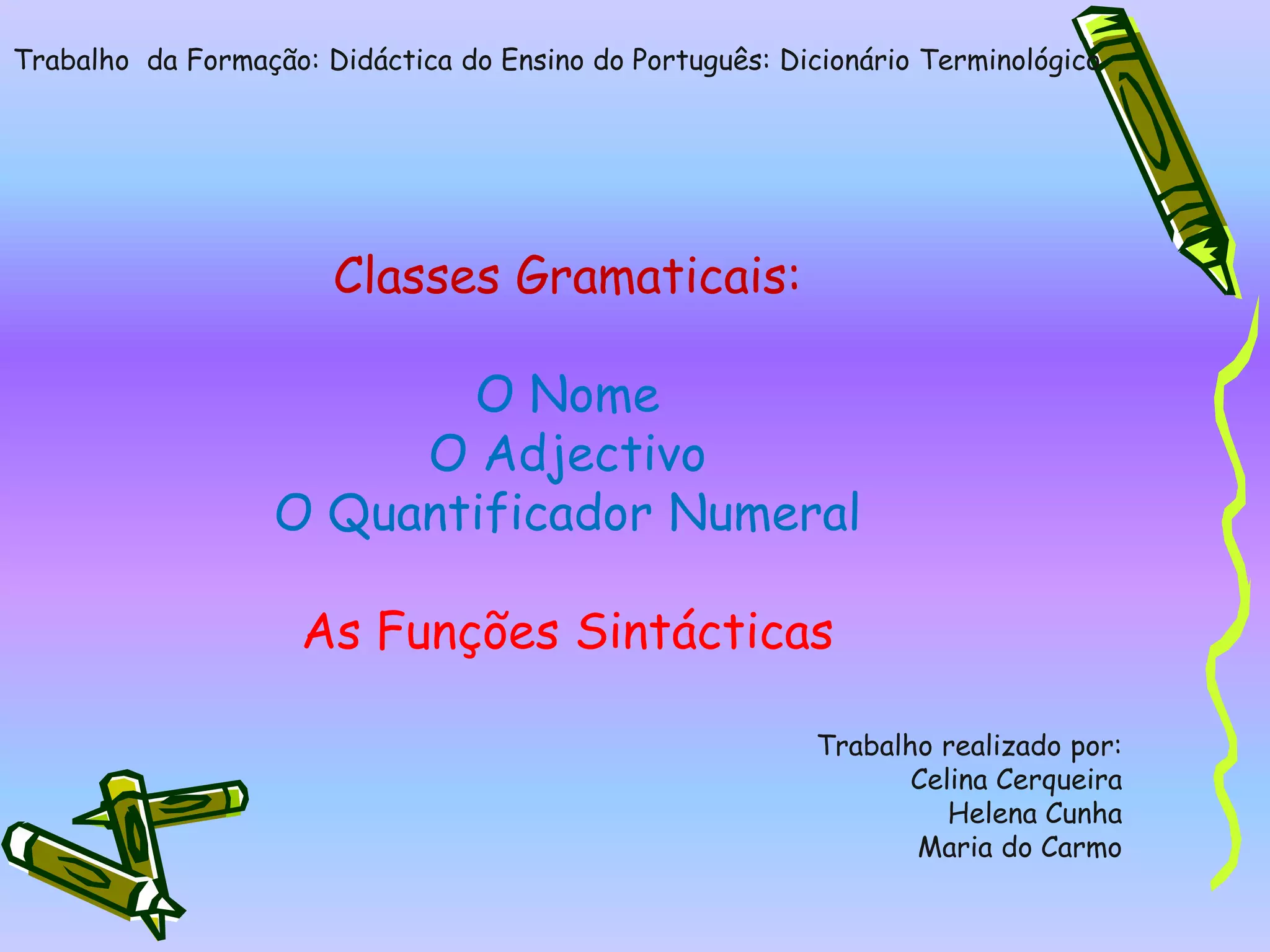As palavras podemagrupar-se em diferentes classes, de acordo com as características que possuem – por exemplo,variação em género (nomes, adjectivos…),variação em tempo/modo(verbos),contexto em que ocorrem (antes de um nome: determinantes).
