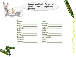 A regra geralpara a formação do plural é acrescentar -s ao final da palavra .Ex: rato-ratosMas há outras formas de fazer o plural, repara: