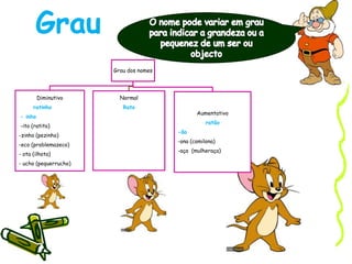 Grau dos adjectivosNormal Ele é alto de superioridade Ele é mais alto do que o pai. Comparativo de igualdade Ele é tão alto como o pai. de inferioridade Ele é menos alto do que o pai. sintético Ele é altíssimo. relativo analítico Ele é muito alto. Superlativo de inferioridade Ele é o menos alto absoluto de superioridade Ele é o mais alto da turma.