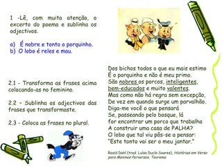 1 -Lê, commuita atenção, o excerto do poema e sublinha os adjectivos. É nobre e tonto o porquinho.O lobo é reles e mau.2.1 - Transforma as frases acima colocando-as no feminino. 2.2 – Sublinha os adjectivos das frases que transformaste. 2.3 - Coloca as frases no plural. Dos bichos todos o que eu mais estimo É o porquinho e não é meu primo. São nobres os porcos, inteligentes,bem-educados e muito valentes. Mas como não há regra sem excepção, De vez em quando surge um parvalhão. Diga-me você o que pensará Se, passeando pelo bosque, lá for encontrar um porco que trabalha A construir uma casa de PALHA? O lobo que tal viu pôs-se a pensar: “Este tonto vai ser o meu jantar.” RoaldDahl (trad. Luísa Ducla Soares), Histórias em Verso para Meninos Perversos, Teorema