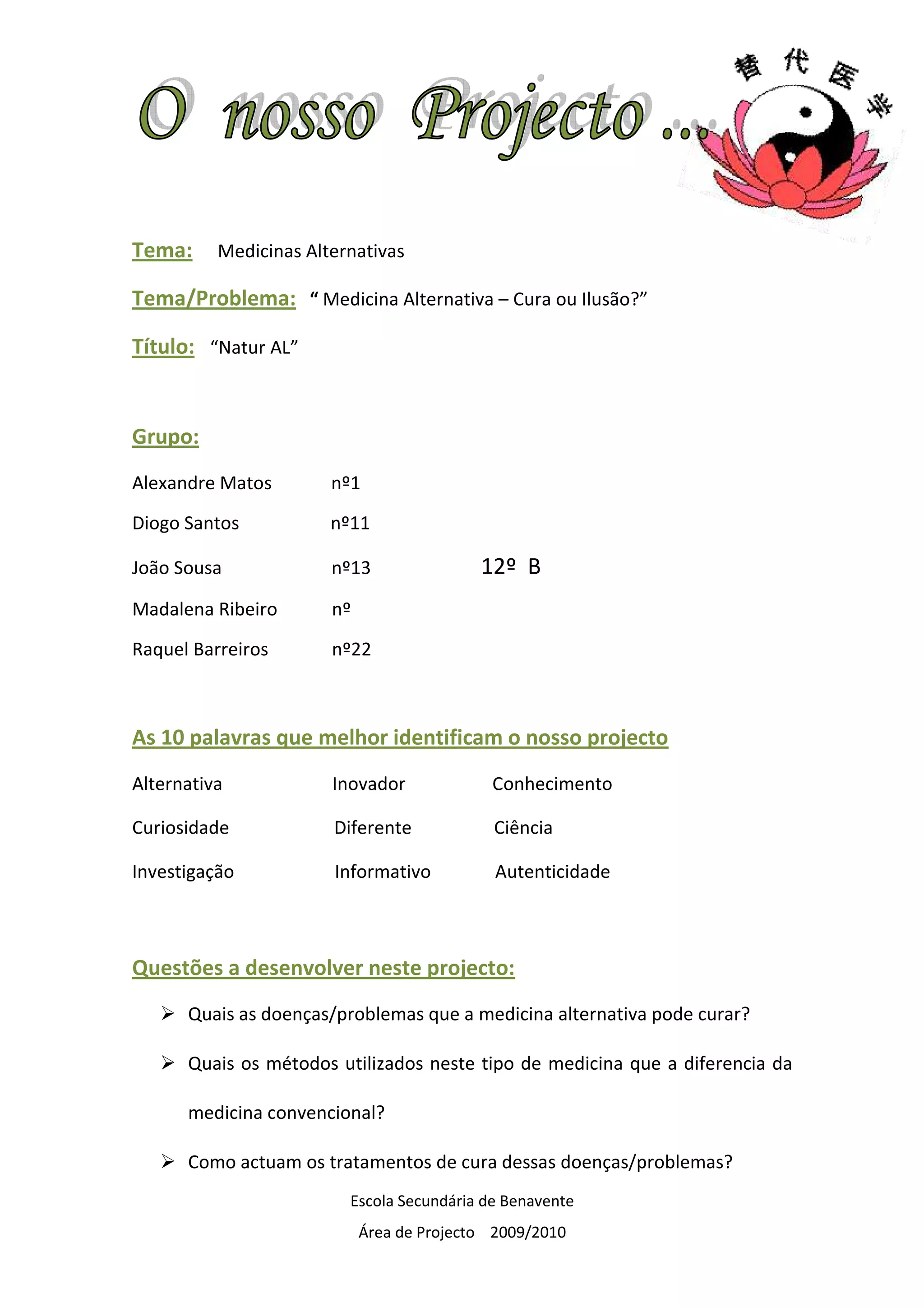 Este documento descreve um projeto de um grupo de estudantes sobre medicinas alternativas. O projeto visa divulgar e sensibilizar as pessoas sobre este tipo de medicina através de panfletos, cartazes, um blogue e uma feira. O grupo também fará entrevistas e um inquérito para avaliar o conhecimento atual sobre o tema.