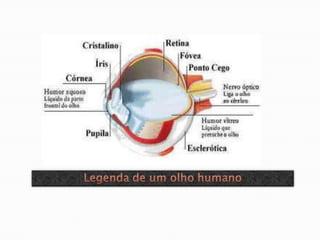 O documento discute a anatomia e funções do olho humano, incluindo suas três camadas (externa, média e interna), assim como distúrbios visuais como astigmatismo, miopia e cegueira. Ele também fornece links sobre esses tópicos.