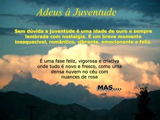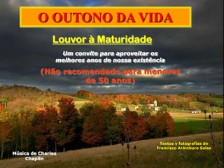 O documento discute os benefícios da maturidade, argumentando que essa fase da vida traz paz e liberdade das incertezas e preocupações da juventude. A maturidade é comparada ao amanhecer e ao mar, lugares de calma e profundidade. O texto encoraja os leitores a aproveitarem os presentes da maturidade e viverem plenamente no momento.