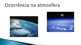 O documento descreve o ozônio, uma variedade alotrópica do oxigênio formada por três átomos de oxigênio. Explica que o ozônio se liquefaz a -112°C e congela a -251,4°C, assumindo uma coloração azul. Também descreve a camada de ozônio na estratosfera que protege a Terra da radiação ultravioleta solar e seu declínio nas últimas décadas, além de seu uso na indústria como agente oxidante.