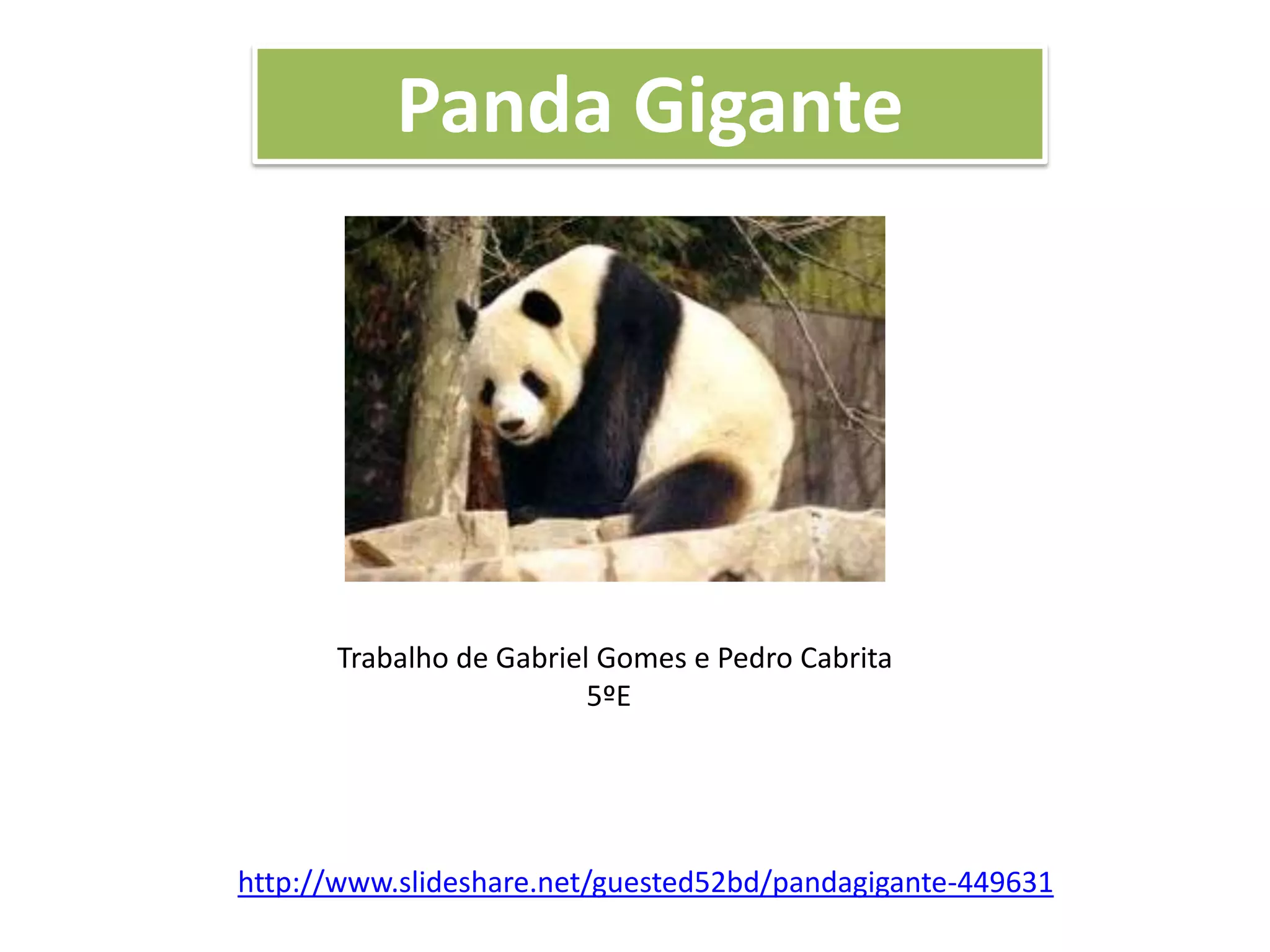 O documento descreve as características físicas e hábitos do panda gigante, incluindo sua pelagem preta e branca, focinho curto, reprodução na primavera com gestação de 135 dias, e estilo de vida solitário passado a dormir e se alimentar de bambu.