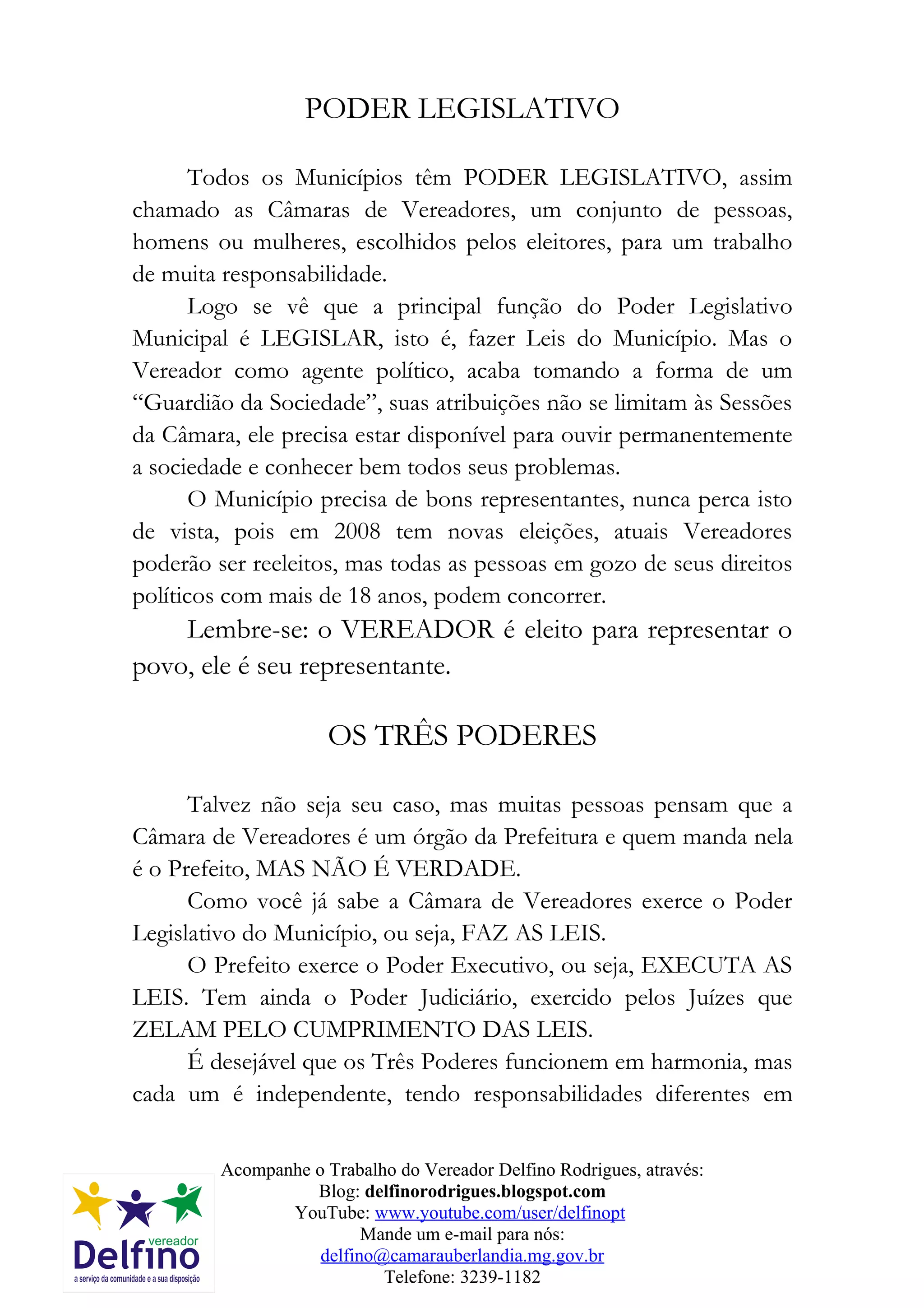 3) Cada município tem sua própria câmara de vereadores que é responsável por legislar as leis municipais de forma independente dos outros poderes.