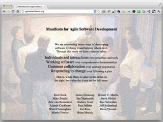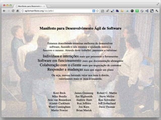 O documento discute os princípios e valores do Manifesto Ágil, que prega a importância da colaboração, da adaptabilidade e da entrega contínua de valor ao cliente no desenvolvimento de software. O manifesto define 11 princípios centrados no indivíduo, na interação, no software funcionando e na resposta a mudanças.