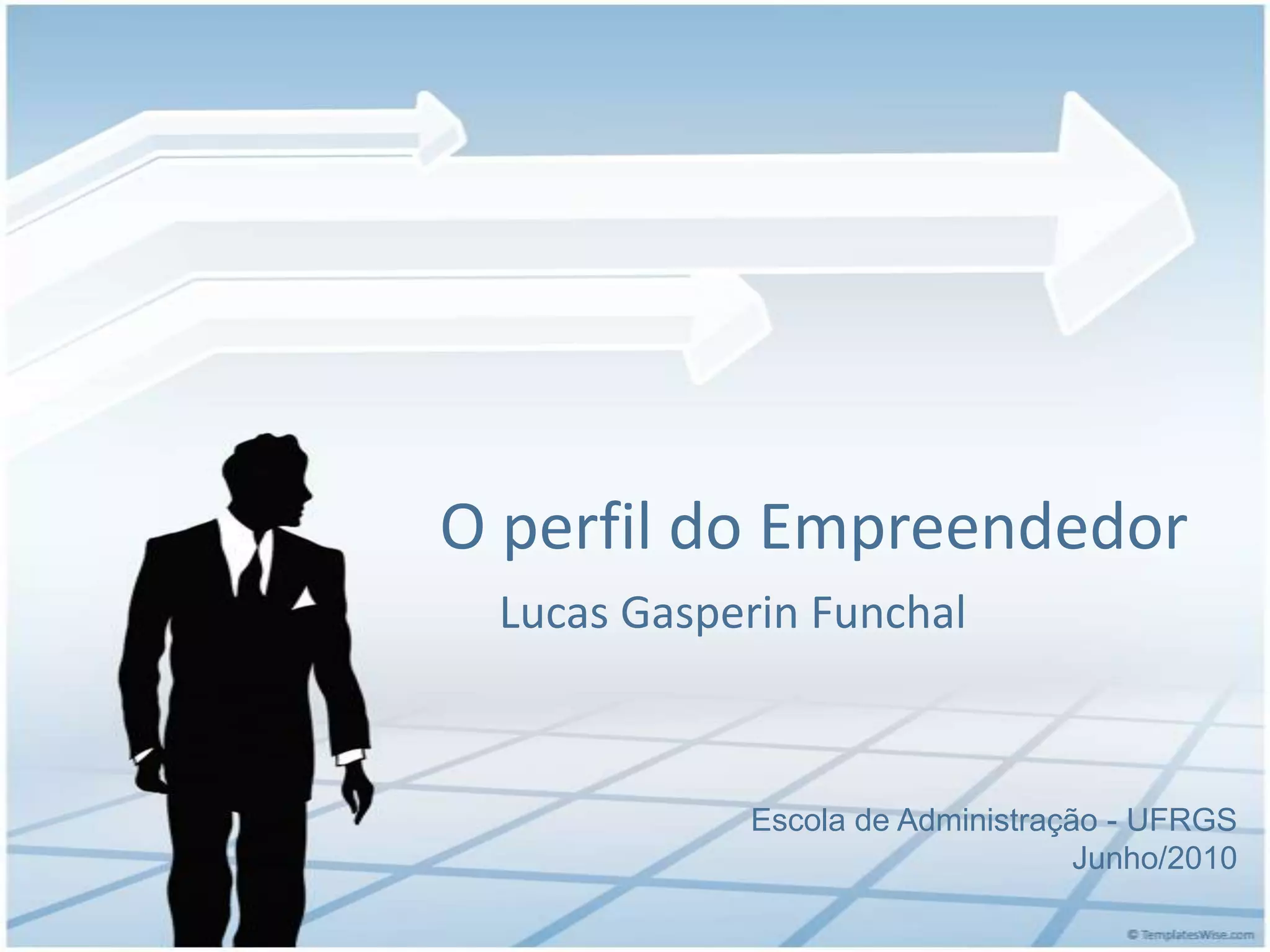 O documento discute o perfil do empreendedor, desmistificando conceitos comuns. Apresenta definições de empreendedorismo de acordo com Schumpeter, Drucker e Morales, destacando que não é um traço de personalidade e sim um comportamento baseado em conceitos e teoria. Também destaca 6 mitos sobre empreendedores, como o fato de que não precisam de educação ou ajuda, e que na verdade empreender exige rede de contatos e redução de riscos. Conclui incentivando o leitor a se arriscar no empreendedorismo