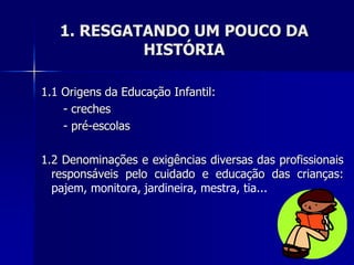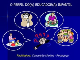 O documento discute a história da educação infantil e as denominações dadas às profissionais ao longo do tempo, como "tia" e "meninas". Também reflete sobre como essas denominações podem influenciar a visão que as educadoras têm de si mesmas e seu trabalho. Finalmente, apresenta 20 características essenciais que um educador infantil deve ter, como gostar de crianças, ser criativo, saber ouvir as crianças e decorar o ambiente.