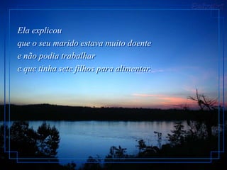 Ela explicou que oseu marido estava muito doente e não podia trabalhar e que tinha sete filhos para alimentar.