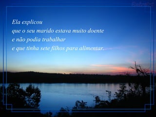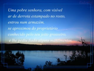Uma pobre mulher pede fiado mantimentos para seu marido doente e sete filhos, mas é rejeitada. Um cliente paga por sua compra quando ela coloca uma oração na balança, mostrando fé em Deus para suprir suas necessidades. O dono fica surpreso com a oração, em vez de uma lista, e dá os mantimentos.