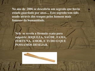 O documento descreve "O Segredo", que é a Lei da Atração, onde os pensamentos positivos atraem boas coisas e os pensamentos negativos atraem coisas ruins. A Lei da Atração foi usada pelos homens mais famosos ao longo da história para alcançar o sucesso, mas foi mantida em segredo por muito tempo. O documento incentiva as pessoas a visualizarem seus sonhos e desejos para atraí-los com a Lei da Atração.