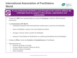Este documento descreve a Associação Internacional de Facilitadores (IAF) e sua representação em Portugal. A IAF foi criada em 1994 e promove padrões para a facilitação em mais de 70 países. A IAF Portugal foi criada em 2017 e visa mobilizar facilitadores de língua portuguesa e estabelecer parcerias com entidades portuguesas, como a Direcção Geral da Saúde, para capacitar profissionais e realizar workshops usando técnicas de facilitação.