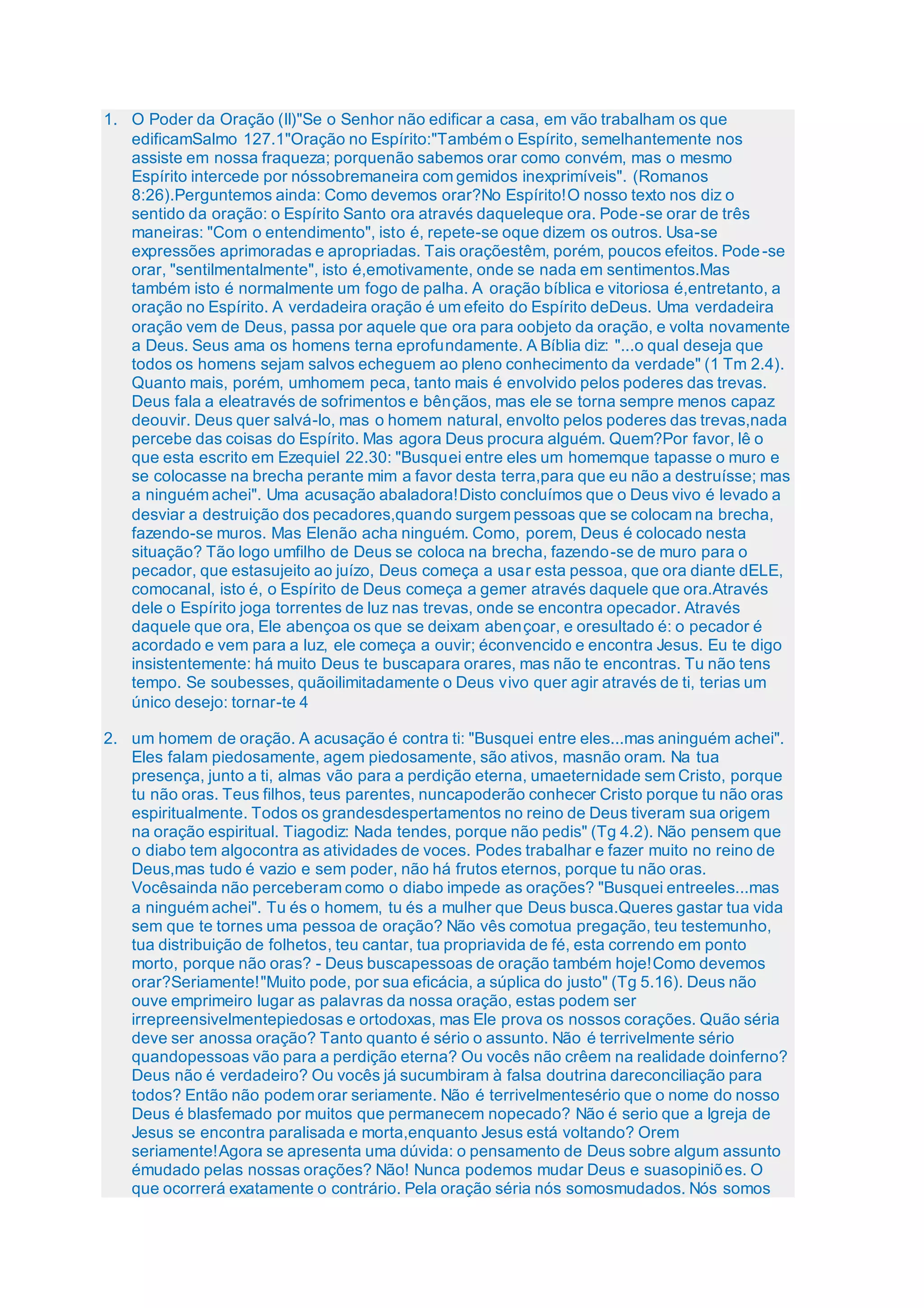 1. O documento discute a importância da oração no Espírito, realizada seriamente e com fé nas promessas de Deus. A oração verdadeira vem de Deus e leva a abençoar outros. 2. Relata o exemplo de John Hyde, que passava longas horas em oração profunda, inspirando outros a se envolverem como "co-intercessores" com Cristo. 3. Exalta a oração como meio pelo qual podemos entrar em comunhão com Deus e ter acesso às Suas bênçãos.