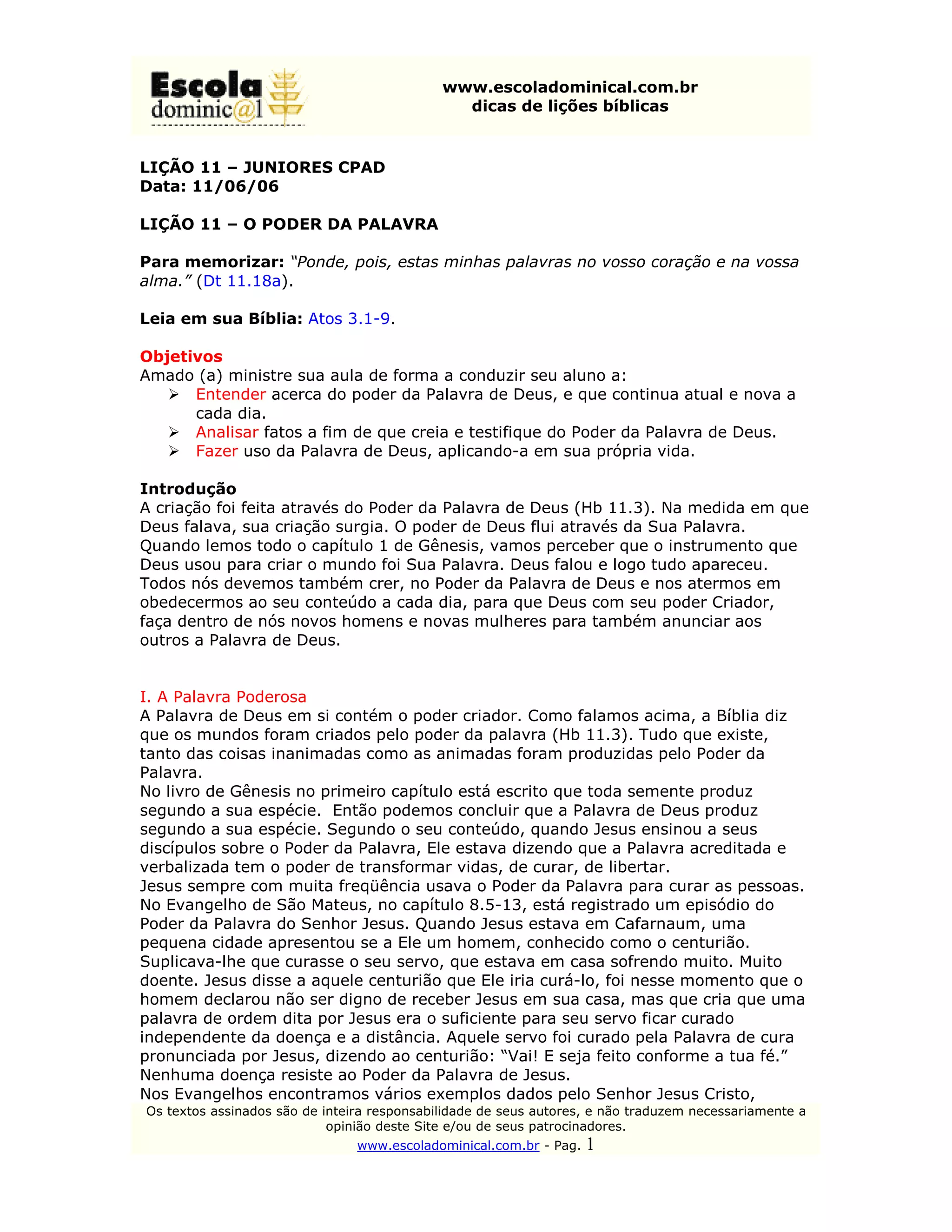 O documento discute o poder da Palavra de Deus, usando como exemplo um homem coxo que foi curado por Pedro e João no Templo. Ele enfatiza que a Palavra de Deus tem poder criador e transformador e que devemos falar sobre ela para as pessoas em necessidade.