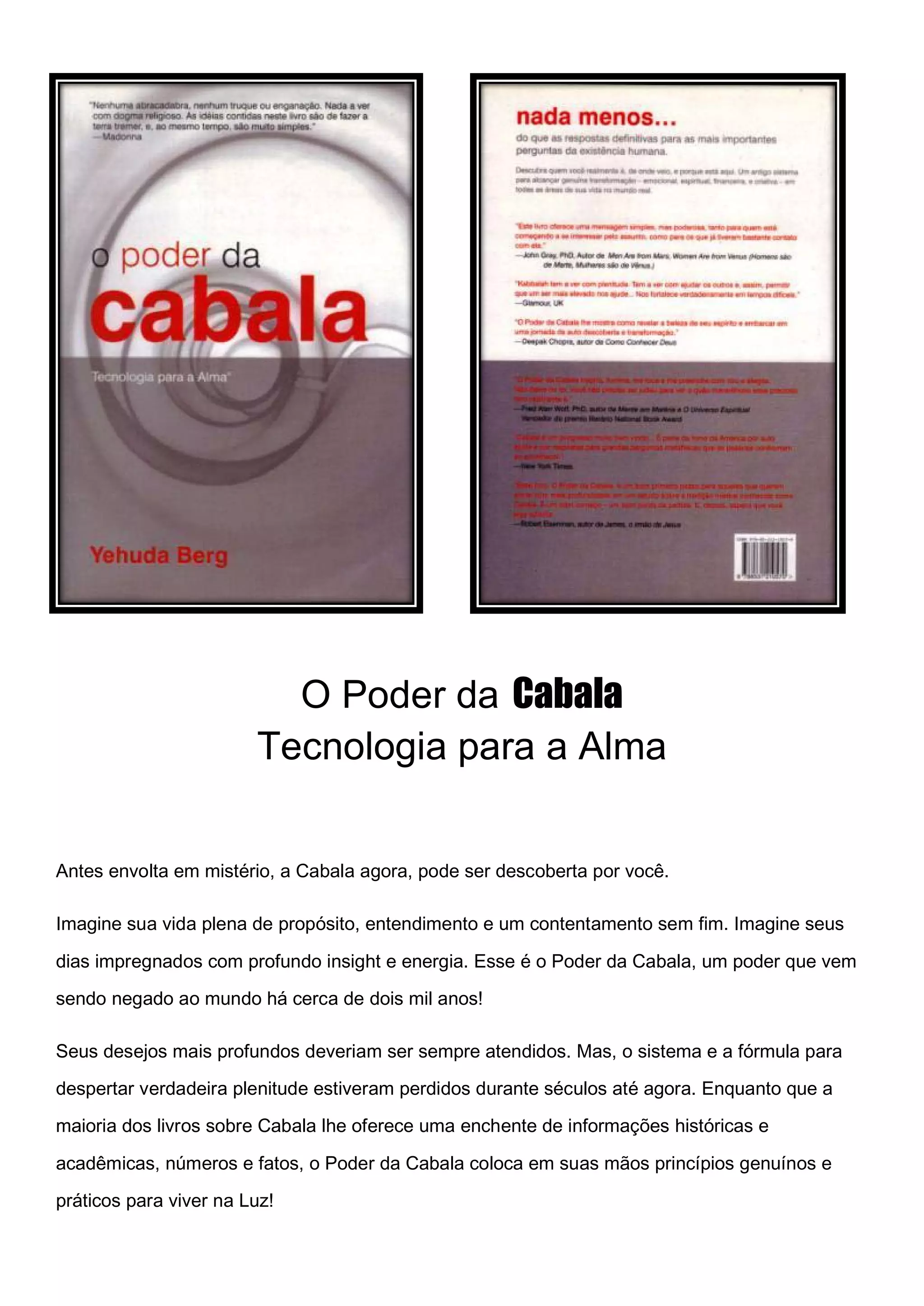 O documento descreve a Cabala como uma antiga sabedoria oculta que revela as leis espirituais e físicas da vida. A Cabala teria influenciado grandes pensadores ao longo da história, mas seus ensinamentos permaneceram ocultos por séculos. Agora, três mestres da Cabala trouxeram esses ensinamentos para serem acessíveis ao público em geral, com o objetivo de trazer felicidade, paz e plenitude para a humanidade. O leitor é advertido a não acreditar cegamente nos ens