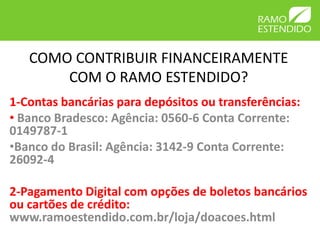 O documento fornece instruções sobre como contribuir financeiramente com uma organização chamada Ramo Estendido, listando opções de depósito bancário e doações digitais. Também discute as festas da Páscoa, Pães Ázimos e Primícias segundo a Bíblia e o significado de redenção.