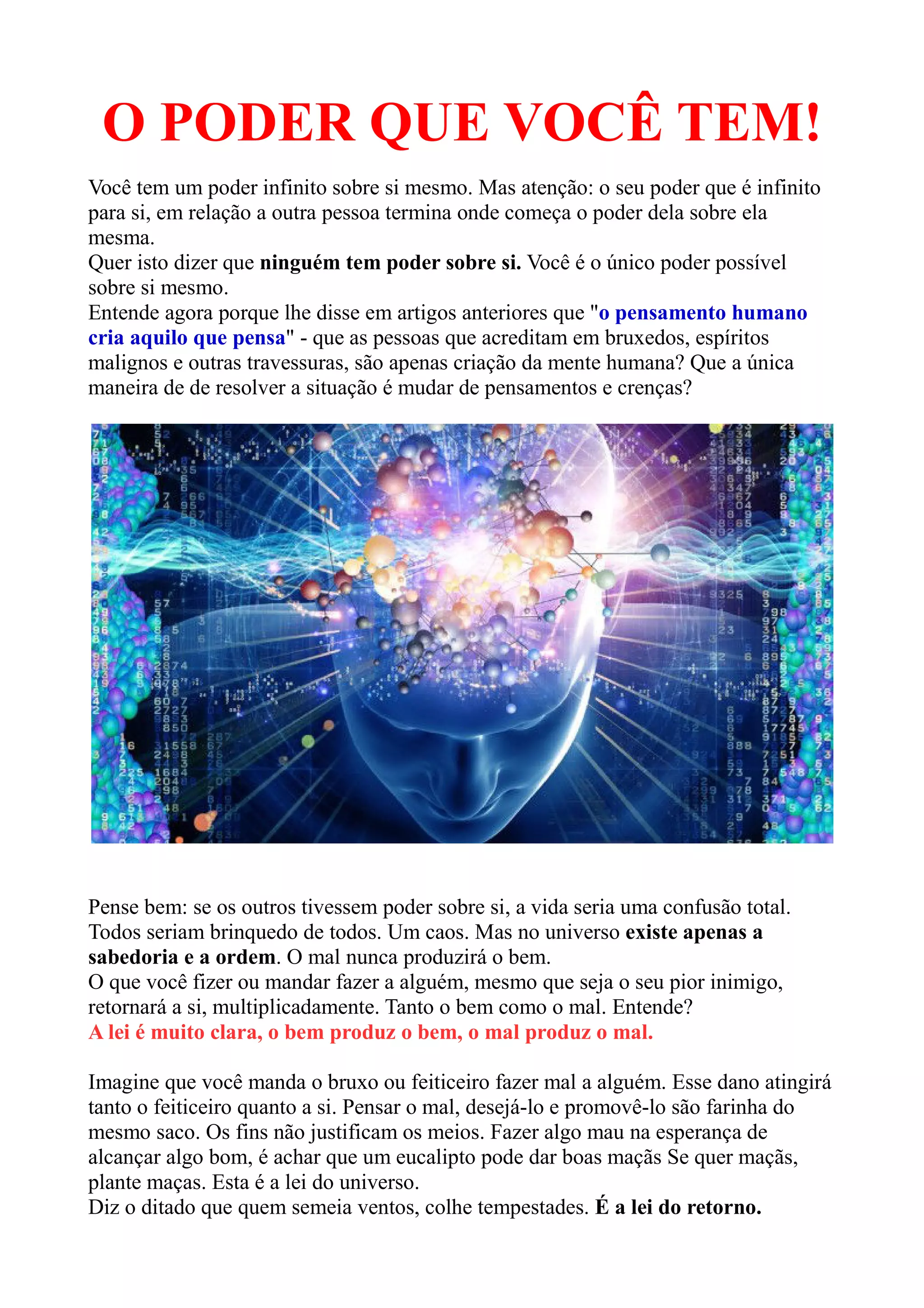 Cada pessoa tem poder infinito sobre si mesma, mas o poder de uma pessoa sobre outra termina onde começa o poder da outra sobre si. Ninguém tem poder sobre os outros, apenas sobre si mesmo. Nossos pensamentos criam nossa realidade, então devemos mudar nossos pensamentos e crenças para resolver problemas. O que fizermos, mesmo para os inimigos, retornará multiplicado, seja bem ou mal.