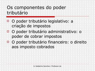 O documento discute os poderes tributários dos municípios em Portugal. Apresenta os três componentes do poder tributário: legislativo, administrativo e financeiro. Também discute os principais impostos municipais, como o Imposto Municipal sobre o Património e o Imposto Municipal sobre as Transmissões, e a diferenciação entre impostos e taxas.