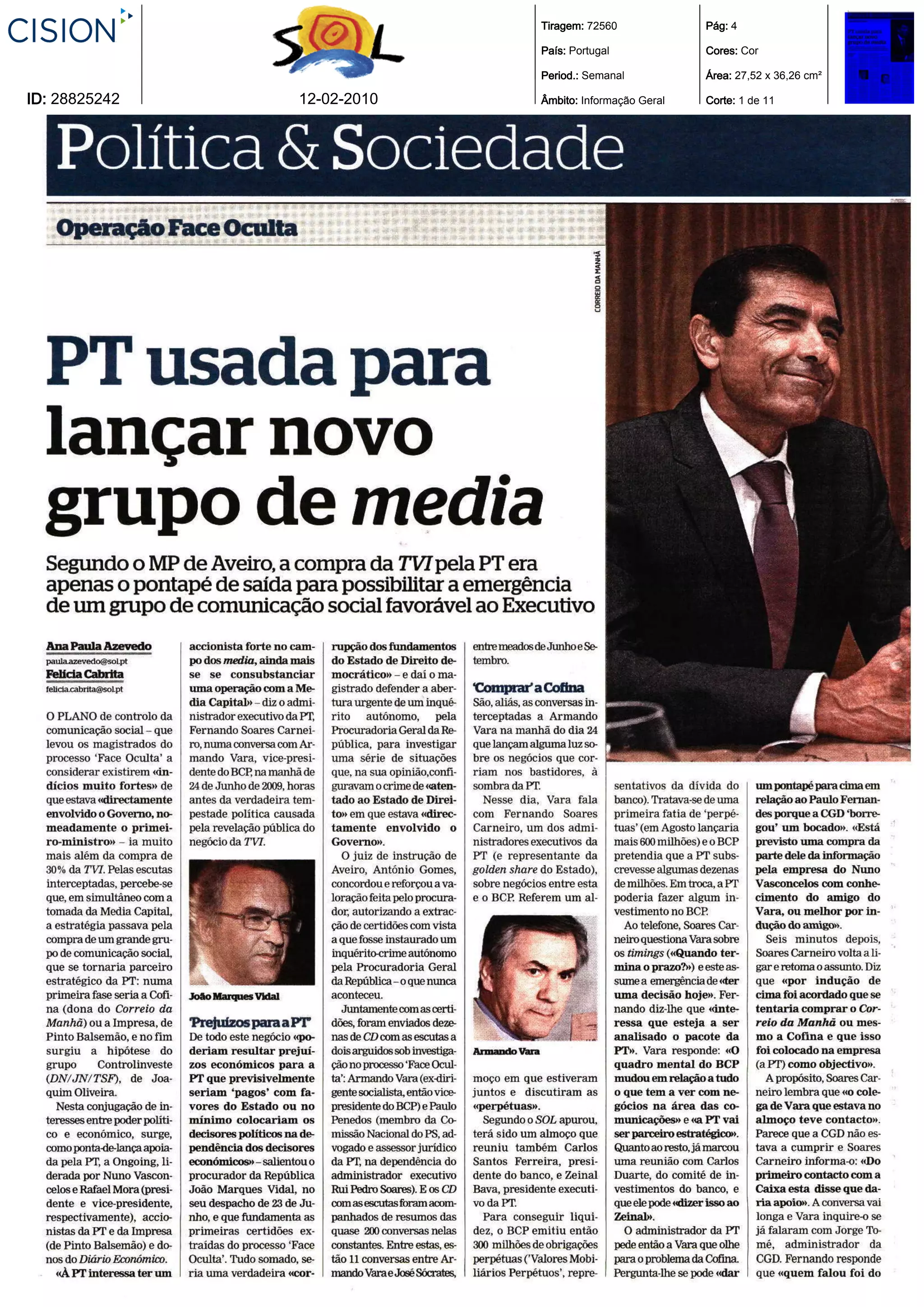 O documento fornece detalhes técnicos de 11 páginas de um periódico semanal português, incluindo a tiragem, país, cores, período de publicação, área e ID para cada página.