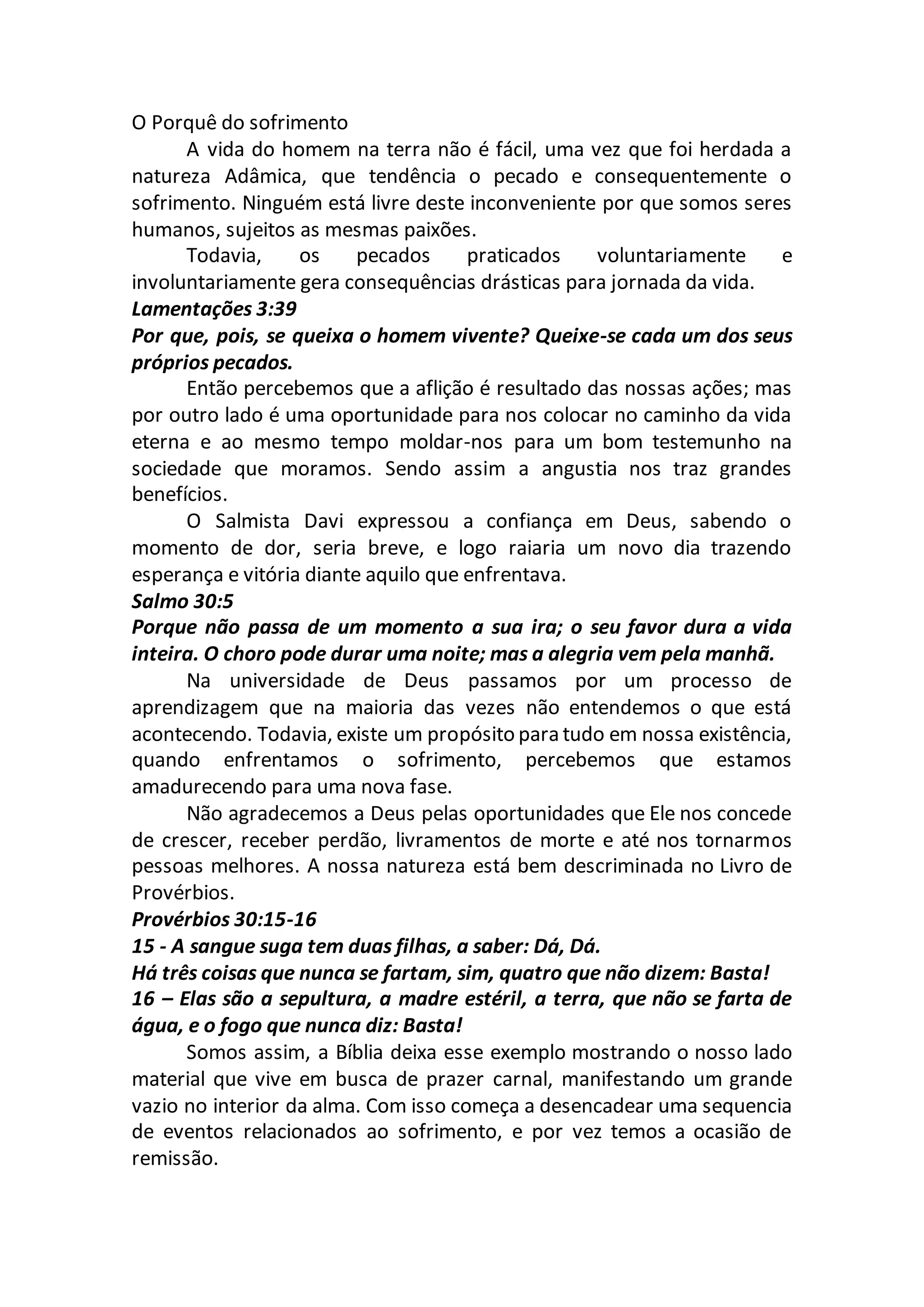 O documento discute o sofrimento humano como resultado do pecado e apresenta a aflição como uma oportunidade para amadurecimento espiritual e progresso rumo à vida eterna. Através de parábolas e metáforas da natureza, são destacados sentimentos de esperança e vencimento, enfatizando que, mesmo em meio a dificuldades, a presença de Jesus e a fé garantem vitória e paz. A conclusão reafirma que, enquanto enfrentamos provas, devemos seguir adiante com confiança, sabendo que a salvação eterna nos aguarda.
