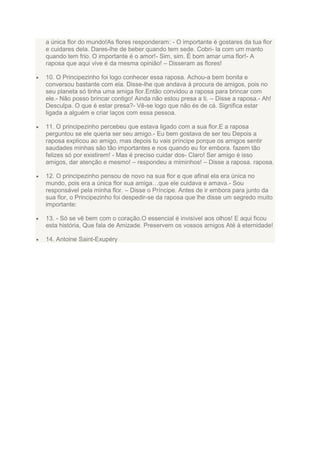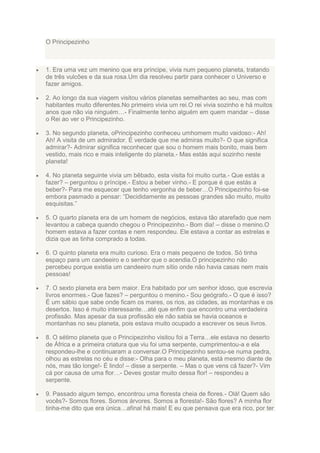 O Principezinho viaja pelo universo e visita vários planetas habitados por pessoas estranhas, incluindo um rei solitário, um homem vaidoso e um homem de negócios ocupado demais. Ele encontra uma serpente no deserto da Terra e descobre uma floresta cheia de flores. Finalmente, faz amizade com uma raposa sábia que lhe ensina sobre a importância de cuidar dos amigos.