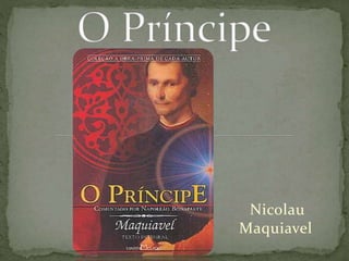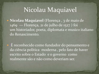 Nicolau Maquiavel foi um historiador e filósofo político italiano do Renascimento que escreveu sobre o Estado e o governo. Seu livro mais famoso, "O Príncipe", analisa como os principados são adquiridos e mantidos, e discute as qualidades necessárias para um governante ser bem-sucedido. O livro fornece conselhos pragmáticos sobre como obter e exercer o poder político de forma eficaz.