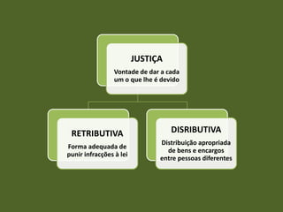 Este documento discute diferentes concepções de justiça distributiva. Apresenta critérios como mérito, necessidades, estatuto social e igualdade para distribuir bens e encargos. Discute igualitarismo, igualdade de oportunidades e utilidade social, concluindo que a equidade de Rawls concilia liberdade e igualdade através do contrato social e princípios de justiça.