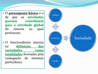 O documento discute a origem e desenvolvimento da sociologia como disciplina acadêmica, desde a Revolução Industrial até as principais correntes teóricas e pensadores clássicos. Aborda o positivismo, funcionalismo, marxismo, compreensivismo e as contribuições de Durkheim, Marx e Weber para a análise científica dos problemas sociais.
