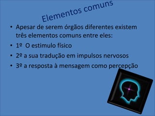 A percepção é construída pelos sistemas sensoriais como visão, olfato, audição, tato e paladar. Apesar de serem órgãos diferentes, existem três elementos comuns entre eles: estímulo físico, tradução em impulsos nervosos e resposta como percepção. É no cérebro que as representações sensoriais são processadas e organizadas, dando sentido ao que percebemos do mundo exterior. A percepção é influenciada pela cultura e experiências anteriores do indivíduo.