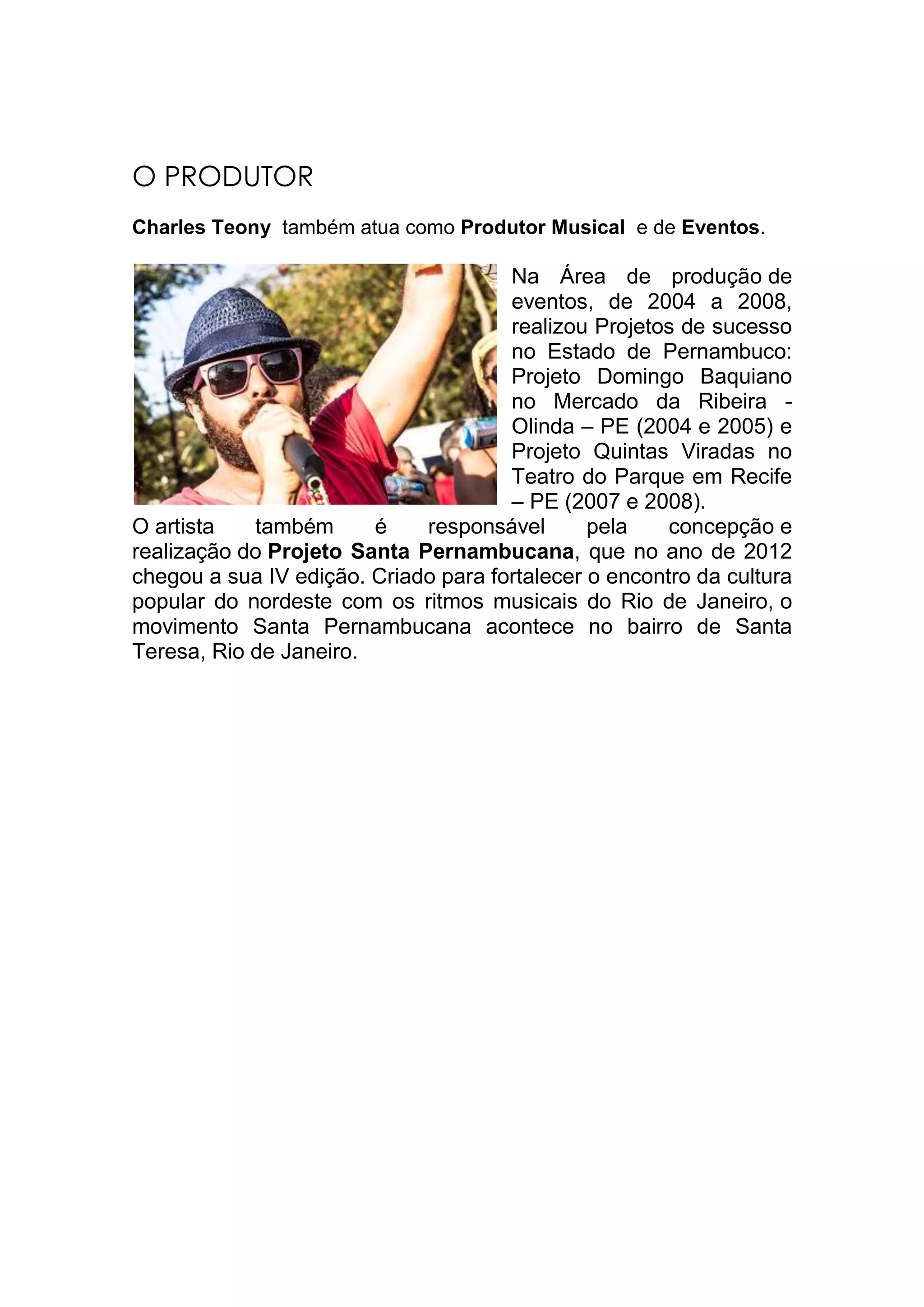 Charles Teony atua como produtor musical e de eventos, tendo realizado com sucesso o Projeto Domingo Baquiano e o Projeto Quintas Viradas em Pernambuco entre 2004 e 2008. Ele também concebeu e realizou o Projeto Santa Pernambucana em 2012, seu quarto ano, para promover a cultura popular nordestina no Rio de Janeiro.