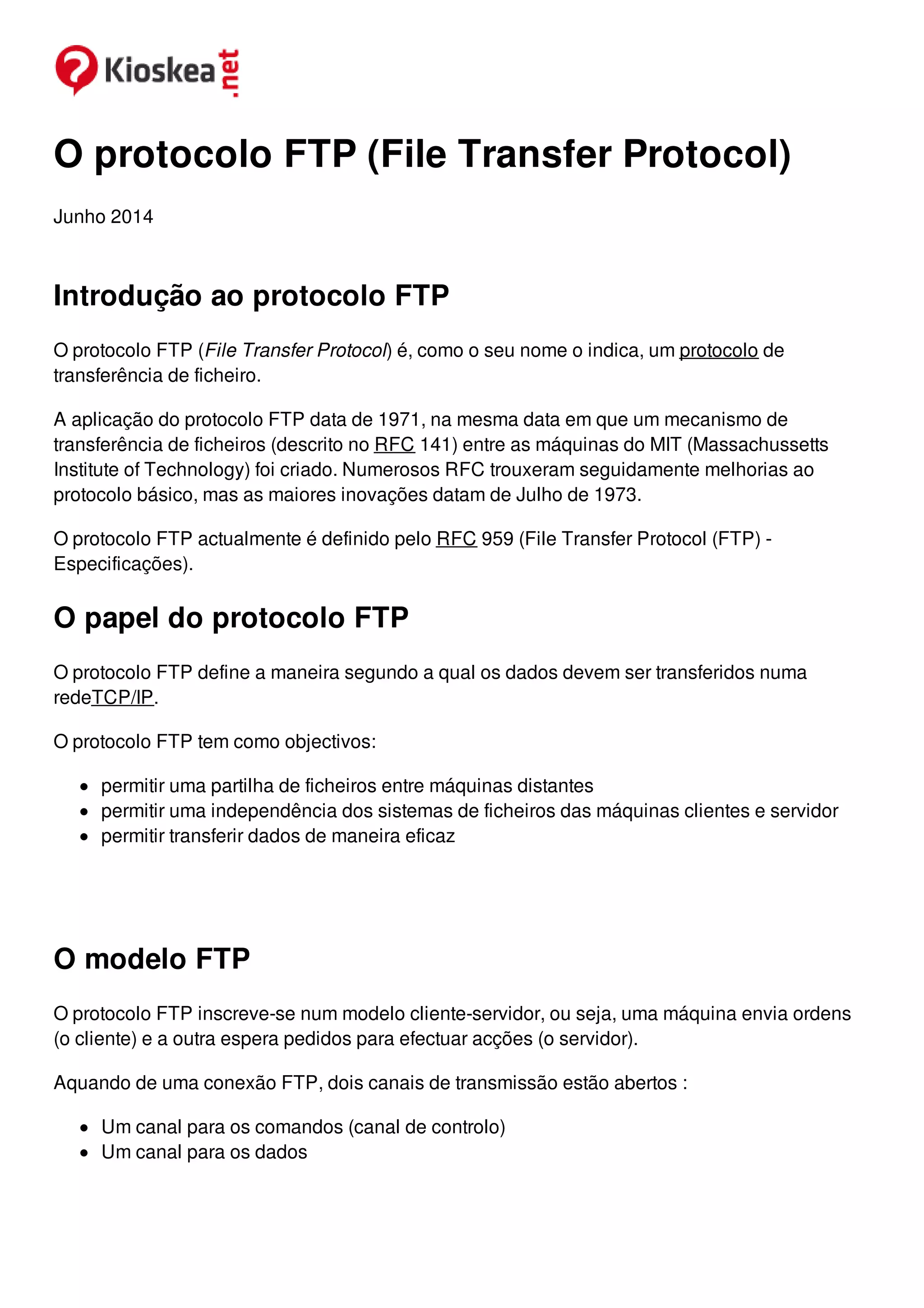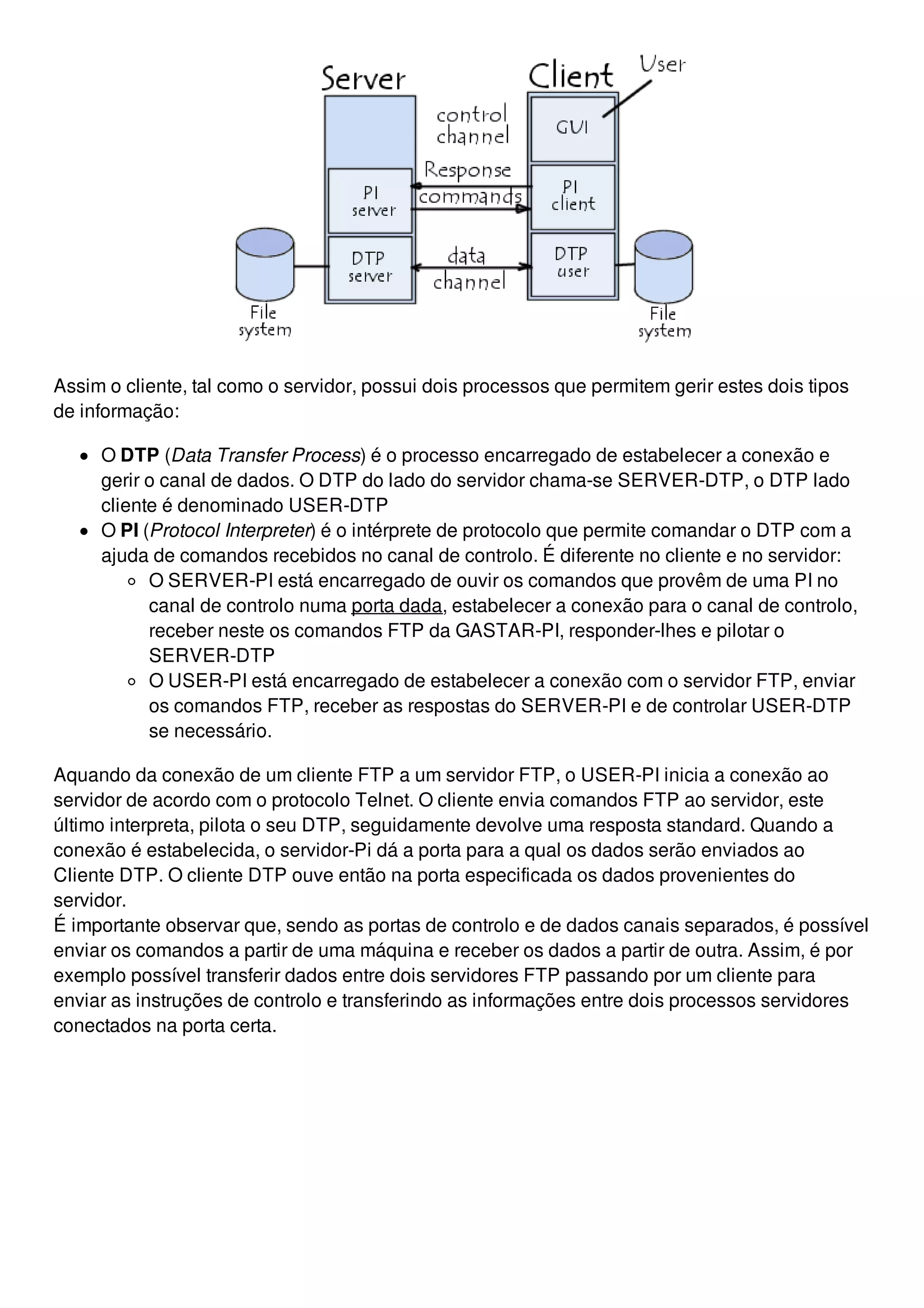 O documento descreve o protocolo FTP, introduzindo seu objetivo de permitir a transferência de arquivos entre máquinas remotas de forma independente dos sistemas de arquivos. Detalha o modelo cliente-servidor do FTP e os principais comandos como RETR, STOR, PASV e LIST para transferir, armazenar e listar arquivos.