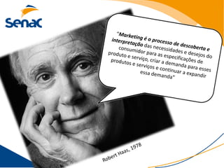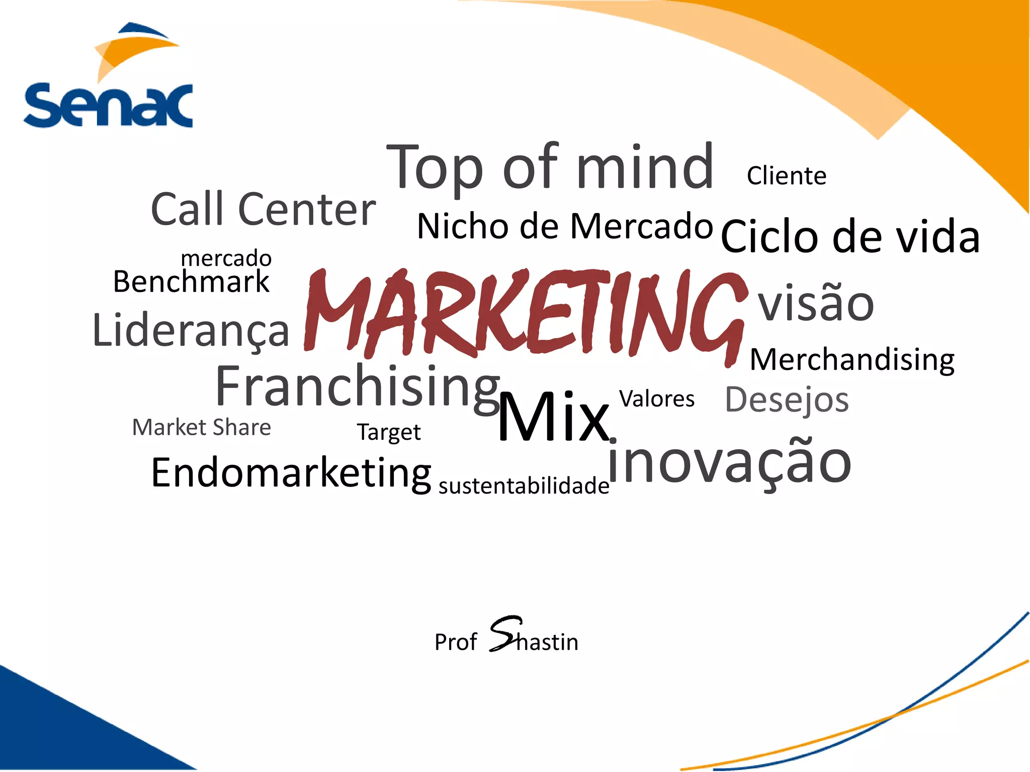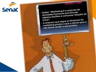 O documento discute conceitos fundamentais de marketing como mix de marketing, ciclo de vida do consumidor, macro e microambiente e estratégias para diferenciar produtos e serviços no mercado. Também aborda tópicos como necessidades do consumidor, pesquisa de mercado, missão, visão e valores da empresa.