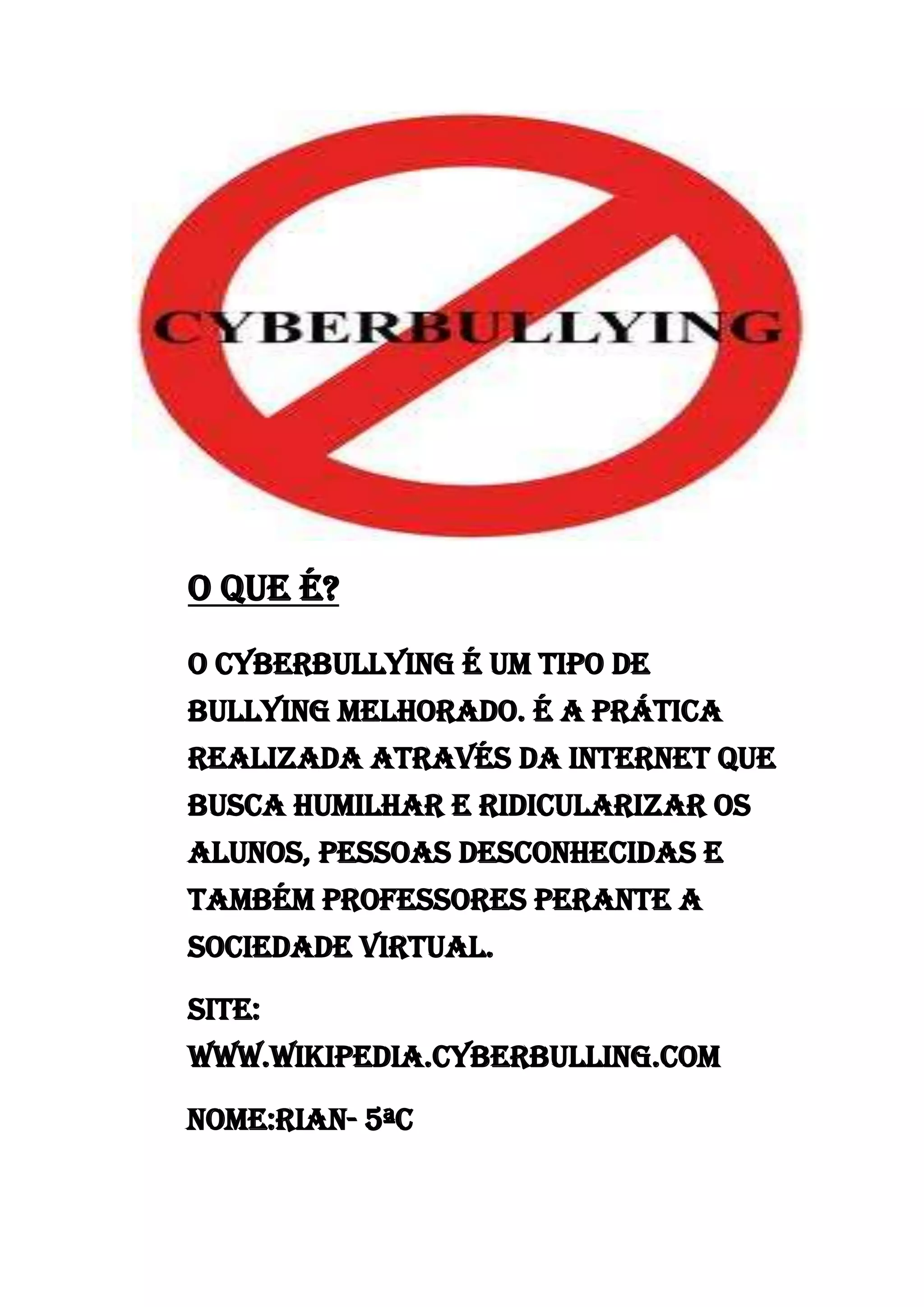 Cyberbullying é um tipo de bullying online que humilha e ridiculariza alunos, pessoas desconhecidas e professores através da internet. Ele ocorre em sites como www.wikipedia.cyberbulling.com e afeta estudantes como "rian da 5aC".