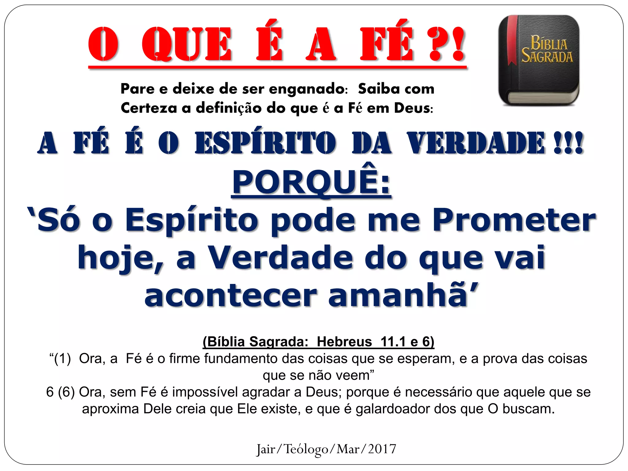 O documento define fé como o Espírito da Verdade, afirmando que só o Espírito pode prometer a verdade do futuro. Ele cita trechos da Bíblia que descrevem a fé como o fundamento das coisas esperadas e necessária para agradar a Deus.