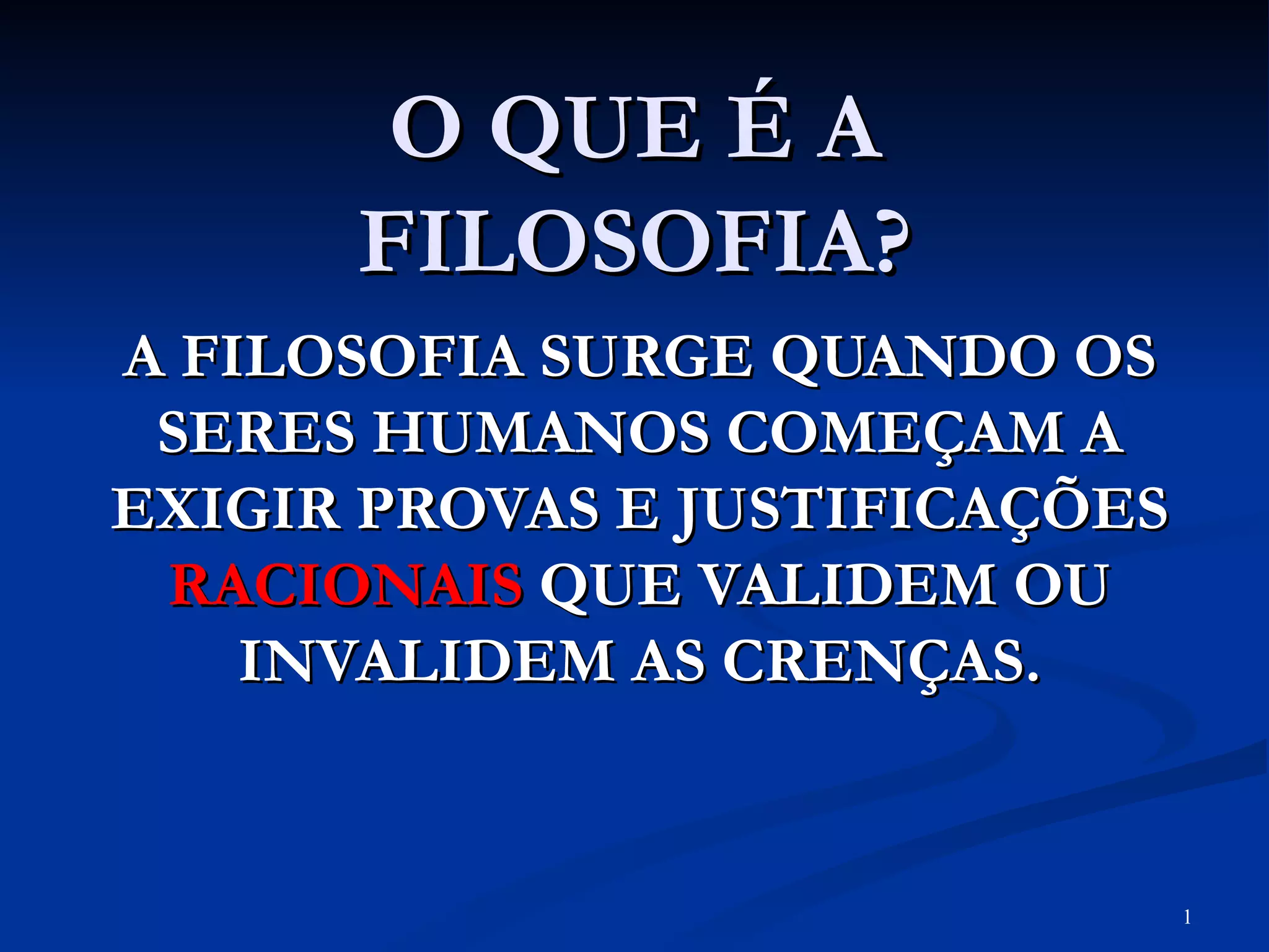 A filosofia surge quando os seres humanos começam a exigir provas e justificativas racionais para validar ou invalidar crenças. A atitude filosófica é caracterizada pela abordagem crítica, questionando preconceitos, fatos e idéias estabelecidas de forma racional e buscando compreender o porquê e como das coisas.