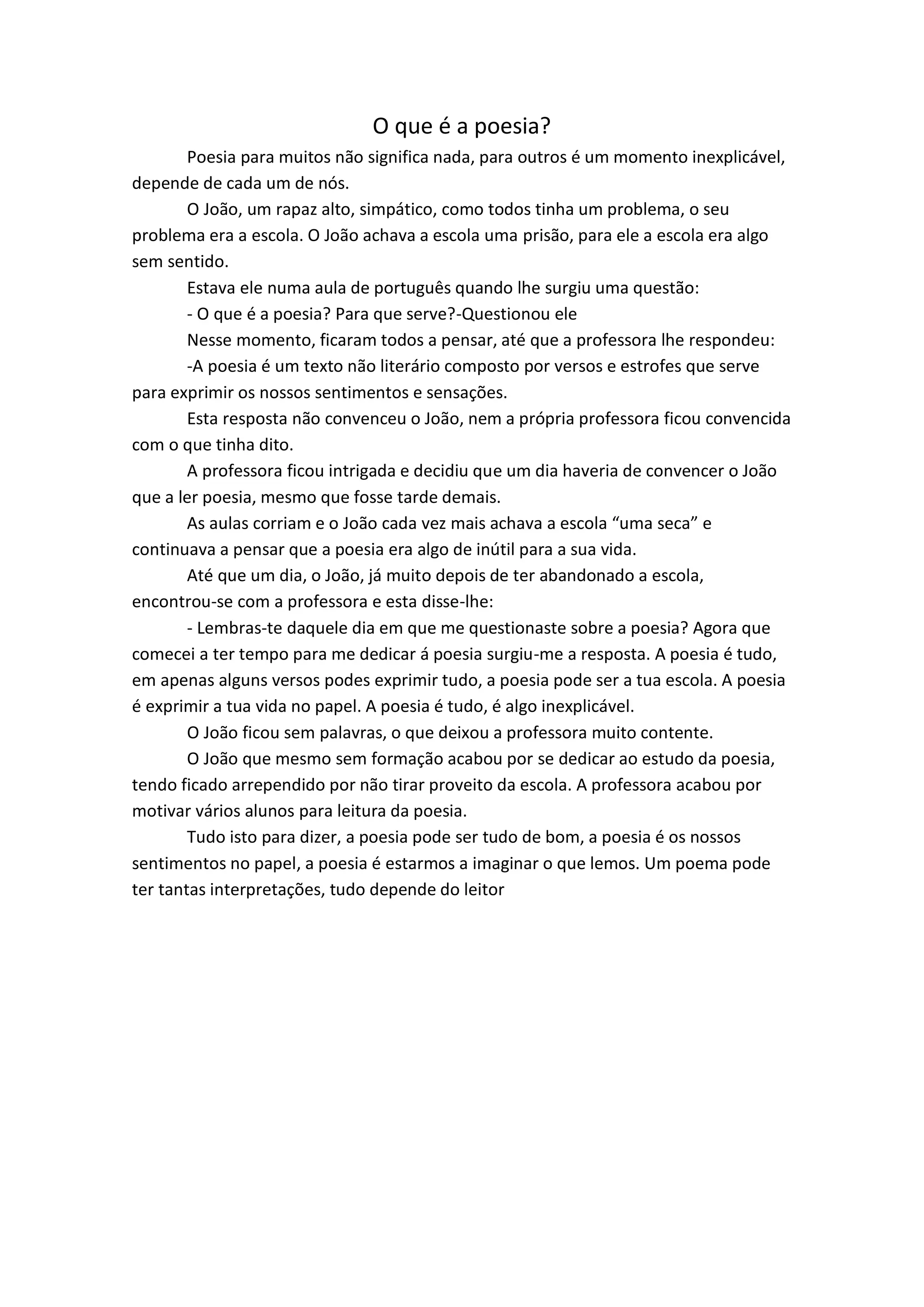 O documento conta a história de um estudante chamado João que não via sentido na escola e questionou o que é poesia. Sua professora tentou explicar, mas não ficou convencida. Anos depois, ela encontrou João e explicou que a poesia permite expressar sentimentos e vida em poucos versos, podendo ser uma escola em si. João ficou sem palavras e passou a estudar poesia, arrependido por não ter aproveitado a escola. A professora motivou outros alunos a ler poesia.