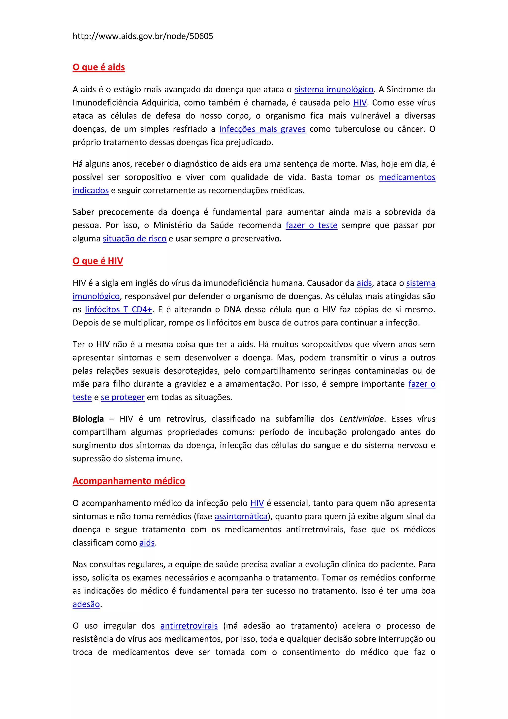 O documento descreve o que é aids e HIV, incluindo como o HIV ataca o sistema imunológico, levando à aids. Também discute a importância do acompanhamento médico, exames de rotina, sintomas, tratamento com antirretrovirais e vacinação de soropositivos.