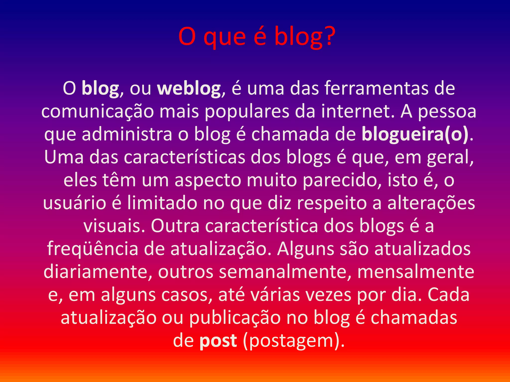 Um blog é uma ferramenta de comunicação popular na internet onde usuários publicam atualizações frequentes chamadas de posts. Blogs geralmente têm um layout padronizado e limitam alterações visuais personalizadas pelo usuário. A pessoa que administra um blog é chamada de blogueiro.