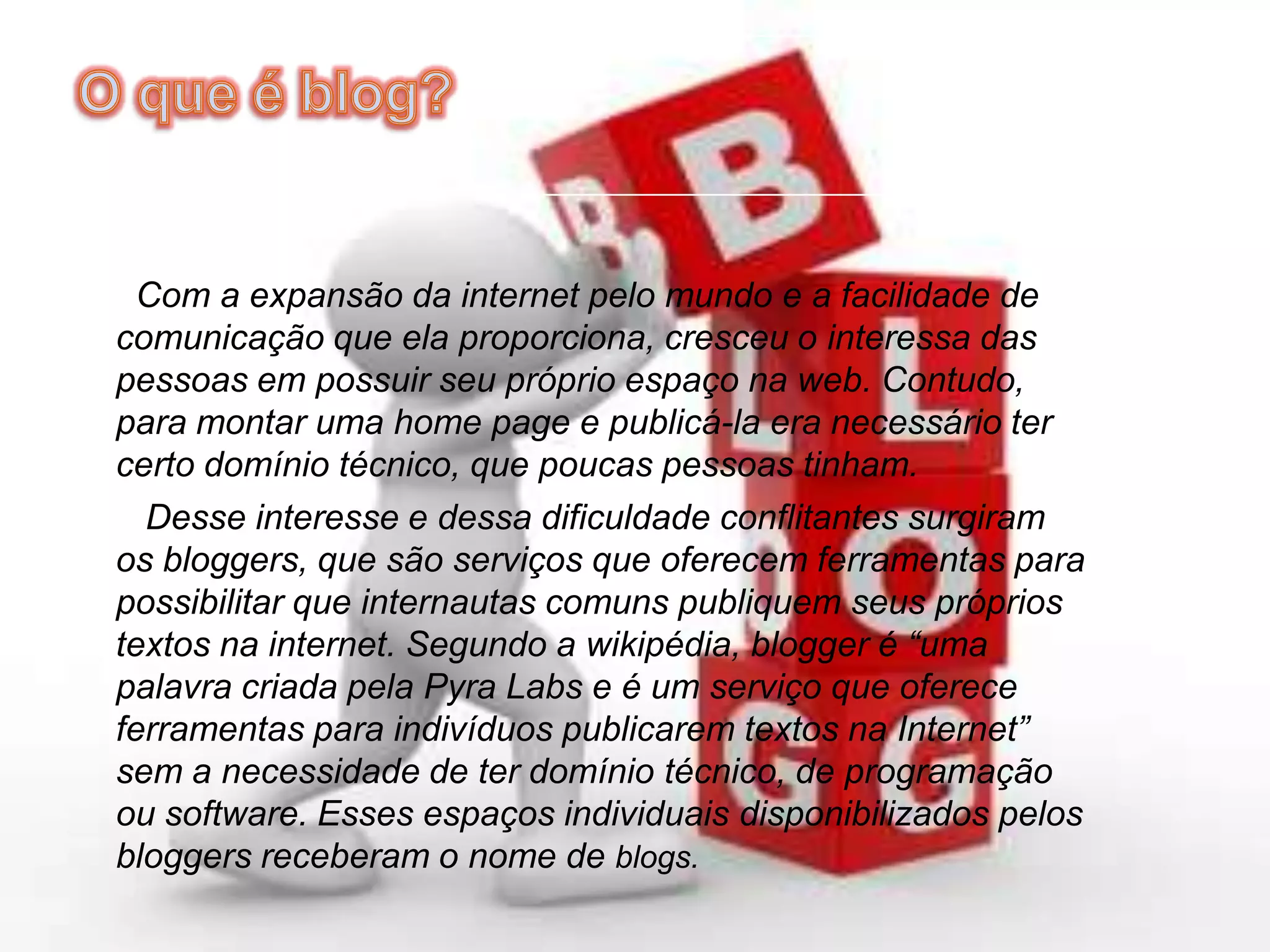 O documento descreve a história e evolução dos blogs, desde seu surgimento como ferramenta para publicação na web por usuários comuns até seu uso atual. Também discute as diferenças entre sites e blogs e a importância de marcadores e créditos de imagens em posts de blog.