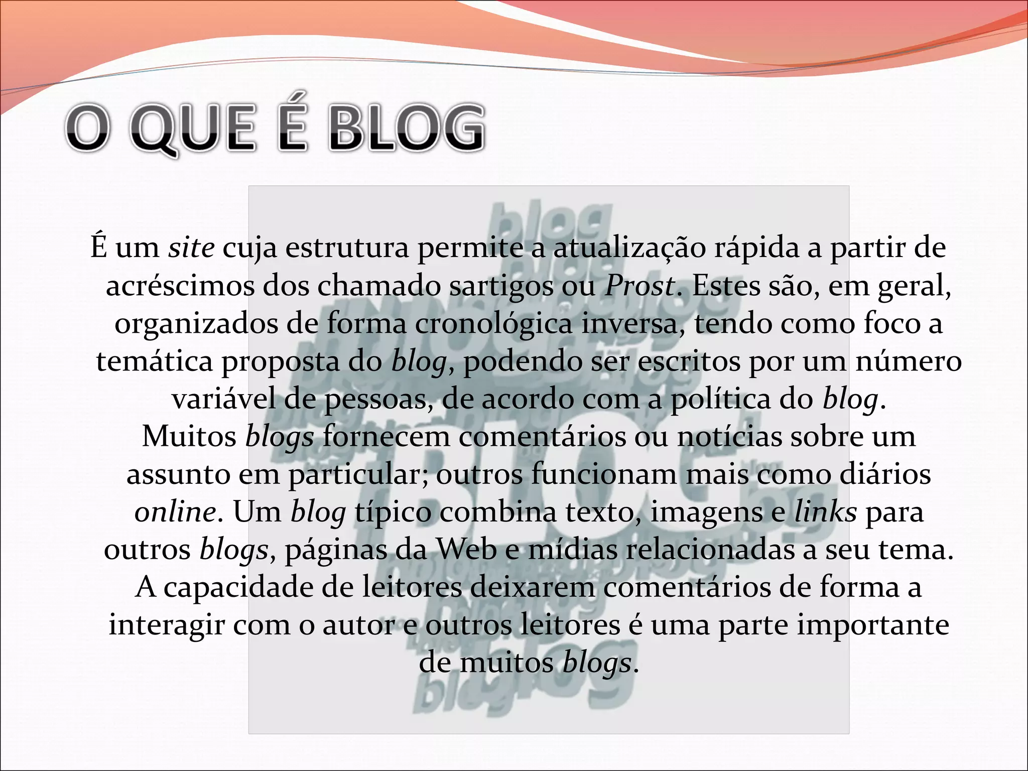 O blog permite atualizações rápidas através de posts, geralmente organizados de forma cronológica inversa. Blogs discutem um assunto em particular e permitem comentários de leitores. A história do blog começou em 1997 e o termo "blog" foi criado em 1999.