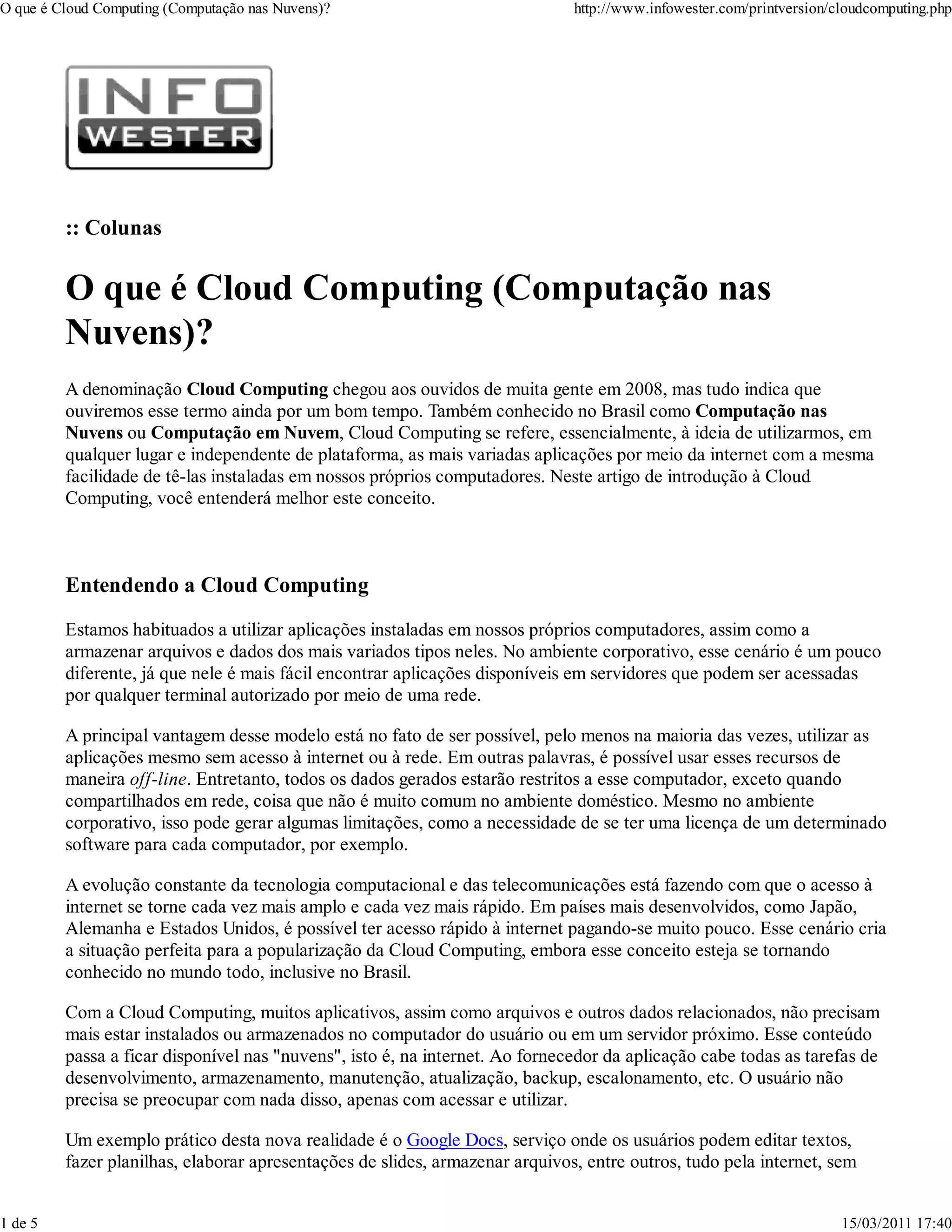 O documento fornece uma introdução abrangente sobre Cloud Computing, explicando seus conceitos-chave, vantagens, exemplos e tendências futuras. Em particular, discute como a computação na nuvem permite que os usuários acessem aplicativos e armazenem dados online independentemente de sua localização ou dispositivo, transferindo a responsabilidade da manutenção para provedores de serviços de nuvem.