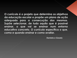 O currículo escolar é um projeto que define objetivos educacionais e um plano de ação adaptado à realidade da escola e dos alunos, integrando conteúdos, metodologias e tecnologias. Ele orienta as práticas pedagógicas e deve ser planejado para promover uma educação inclusiva e contextualizada, assegurando que o aprendizado seja significativo. A tecnologia é vista como uma ferramenta essencial que deve ser integrada de modo a enriquecer o ensino e a aprendizagem, promovendo a inclusão digital.