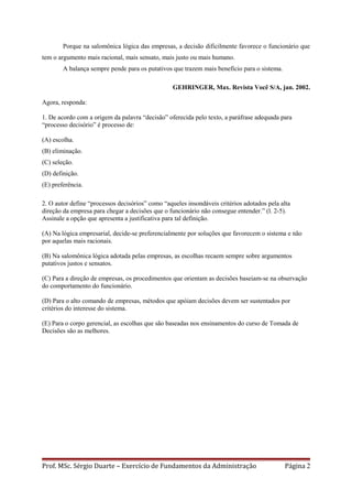 [1] O texto discute o significado da palavra "decisão" e como ela se relaciona com o processo decisório nas empresas. [2] Ele define processo decisório como os critérios usados pela alta gestão para tomar decisões que os funcionários não entendem. [3] O autor argumenta que as decisões nas empresas tendem a favorecer soluções que beneficiam o sistema, não as mais racionais ou humanas.