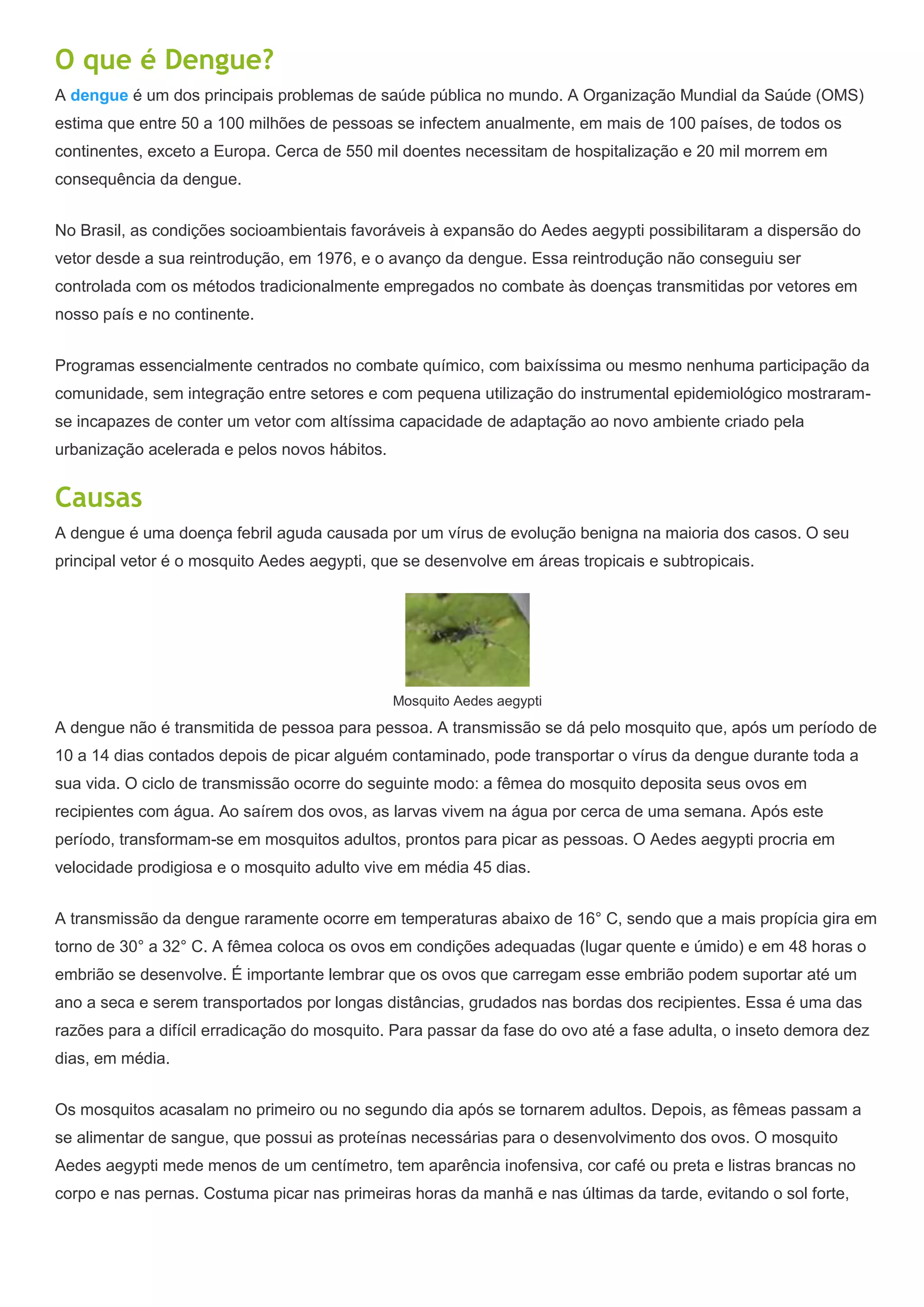 A dengue é uma doença viral transmitida pelo mosquito Aedes aegypti que infecta milhões de pessoas anualmente. Ela causa febre alta e fortes dores no corpo e articulações. Embora a maioria dos casos seja leve, a forma hemorrágica pode ser fatal se não tratada corretamente com repouso e reidratação.