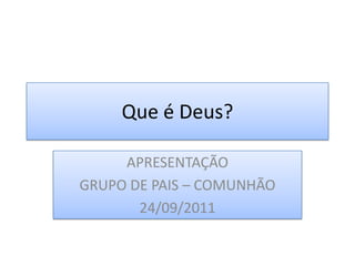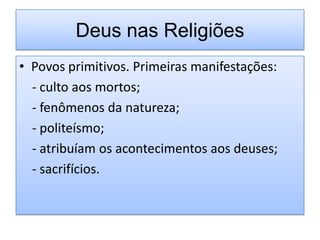 O documento discute diferentes visões de Deus em religiões e filosofia ao longo da história. Ele descreve como Deus era visto nas religiões antigas como politeístas e como o monoteísmo judaico evoluiu. Também discute visões filosóficas de Deus de pensadores como Descartes, Nietzsche e Spinoza. Por fim, resume a visão de Deus no Espiritismo como a inteligência suprema e causa de todas as coisas.