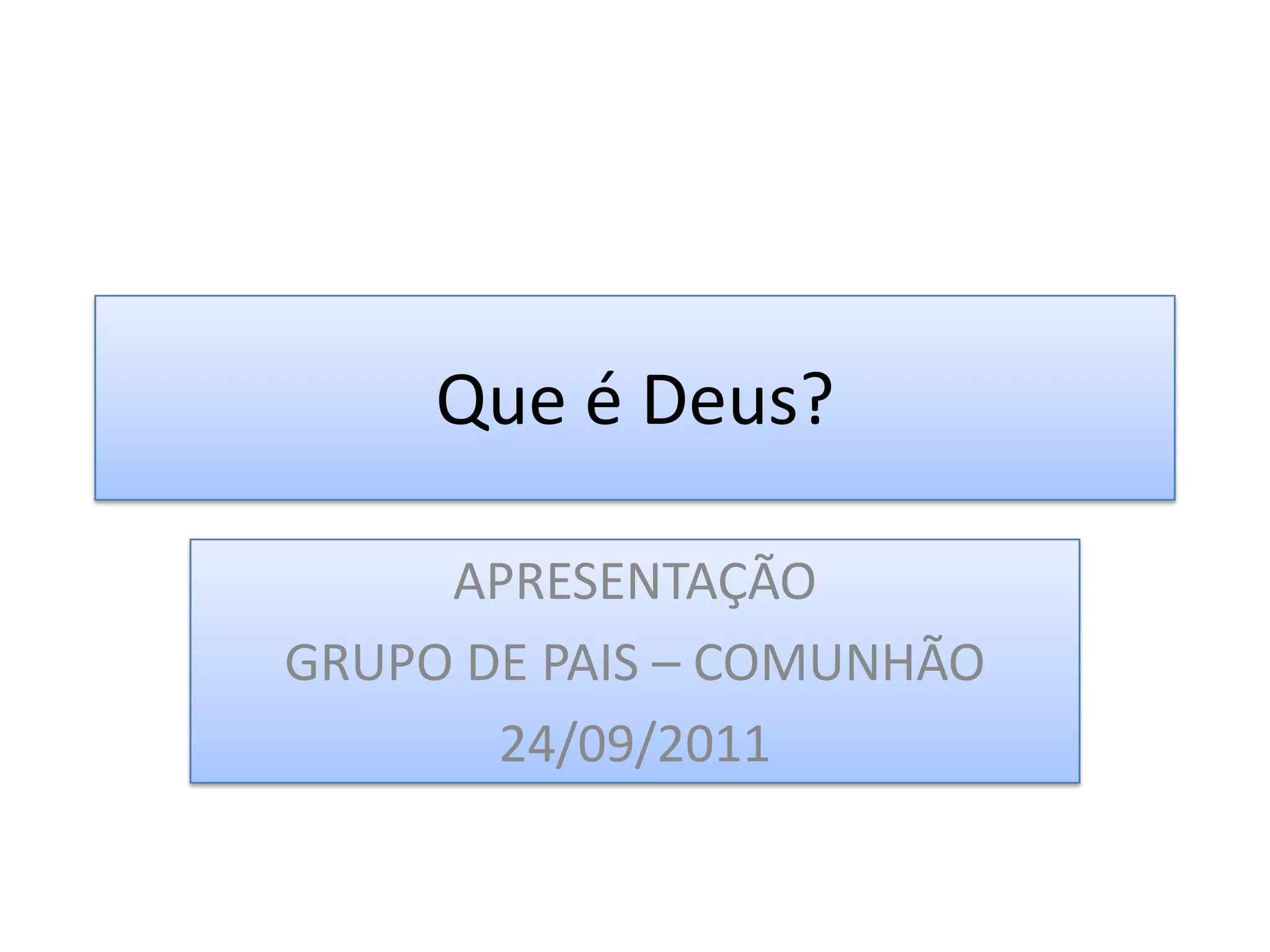 O documento discute diferentes visões de Deus em religiões e filosofia ao longo da história. Ele descreve como Deus era visto nas religiões antigas como politeístas e como o monoteísmo judaico evoluiu. Também discute visões filosóficas de Deus de pensadores como Descartes, Nietzsche e Spinoza. Por fim, resume a visão de Deus no Espiritismo como a inteligência suprema e causa de todas as coisas.