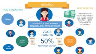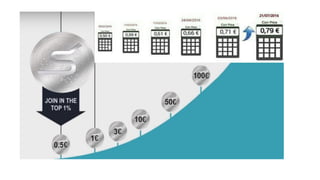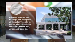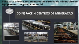 O documento promove o serviço Coinspace, que oferece pacotes de mineração de criptomoeda gerenciados. Os pacotes variam de €50 a €24,000 e prometem lucros diários em moedas mineradas. Coinspace também oferece um plano de compensação para parceiros que recrutam novos clientes.