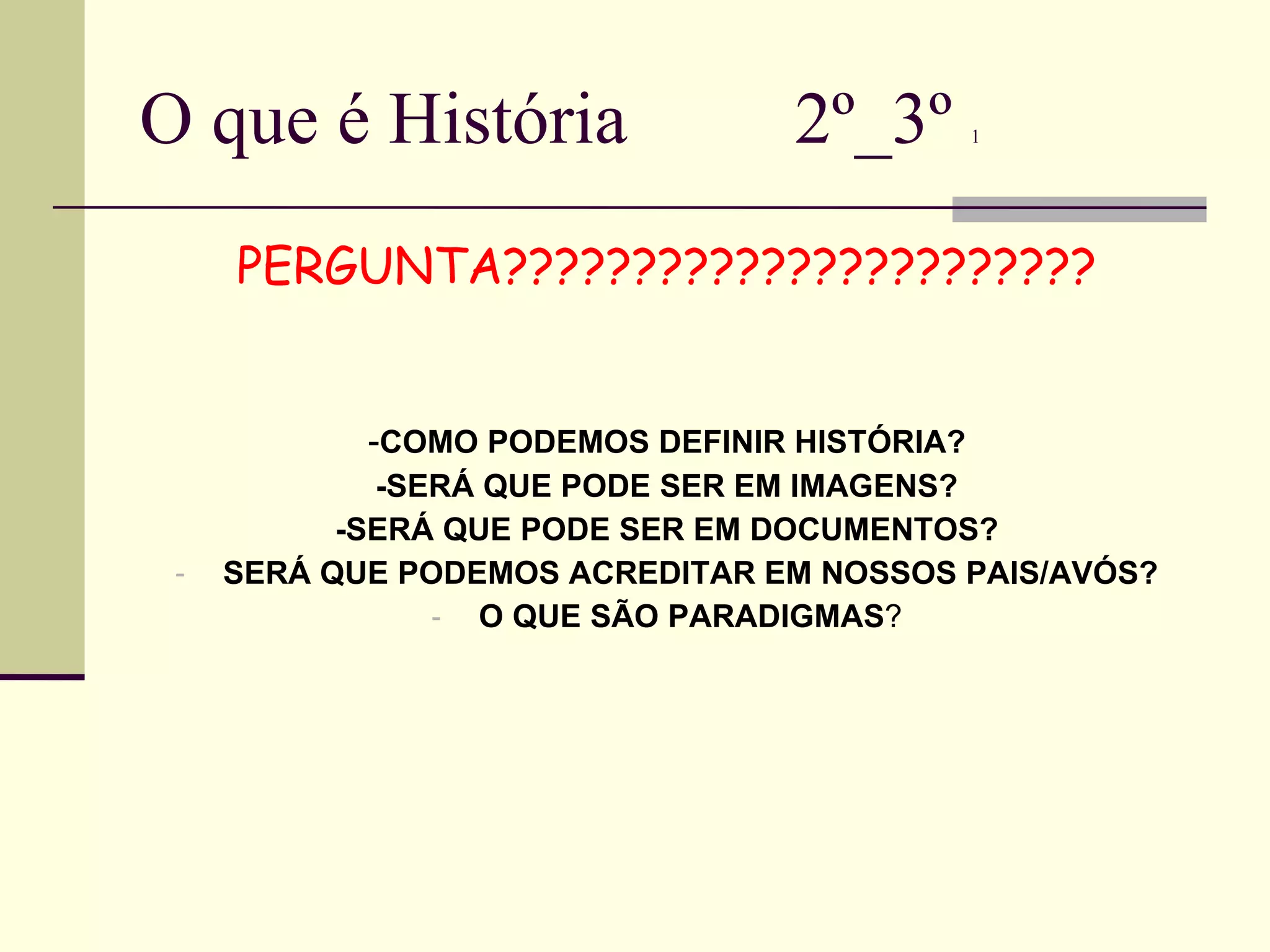 Este documento discute várias questões sobre o que é história, incluindo como podemos definir história, se ela pode ser representada por imagens ou documentos, se podemos acreditar nos relatos de nossos pais e avós, e o que são paradigmas históricos. Ele também afirma que tudo é história e que fazemos parte dela como sujeitos históricos que produzem conhecimento.