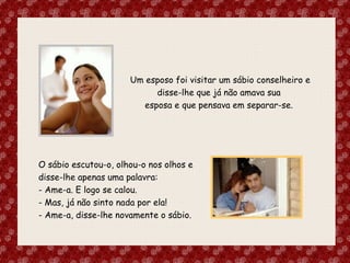 Um esposo foivisitar um sábio conselheiro e disse-lhe que já não amava sua esposa e que pensava em separar-se. O sábio escutou-o, olhou-o nos olhos e disse-lhe apenas uma palavra: - Ame-a. E logo se calou. - Mas, já não sinto nada por ela! - Ame-a, disse-lhe novamente o sábio.
